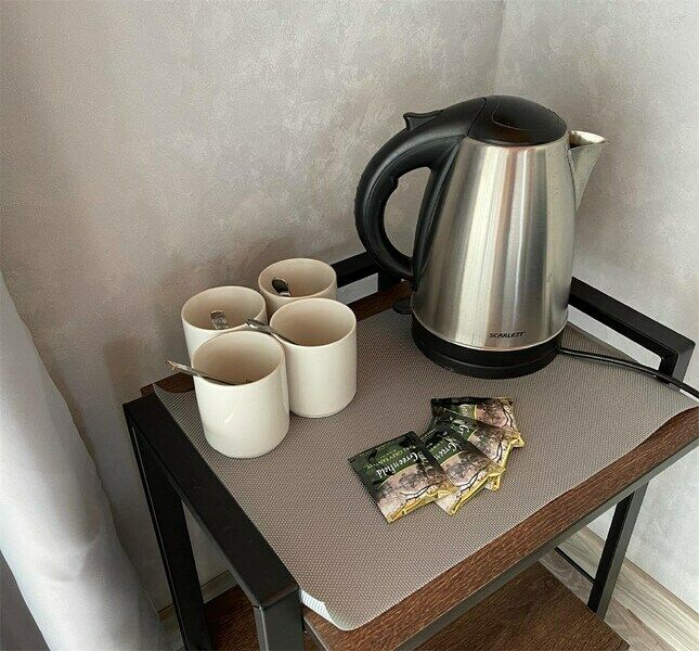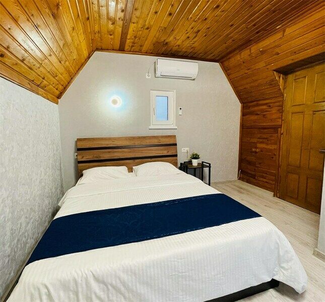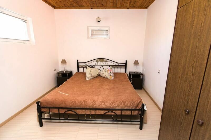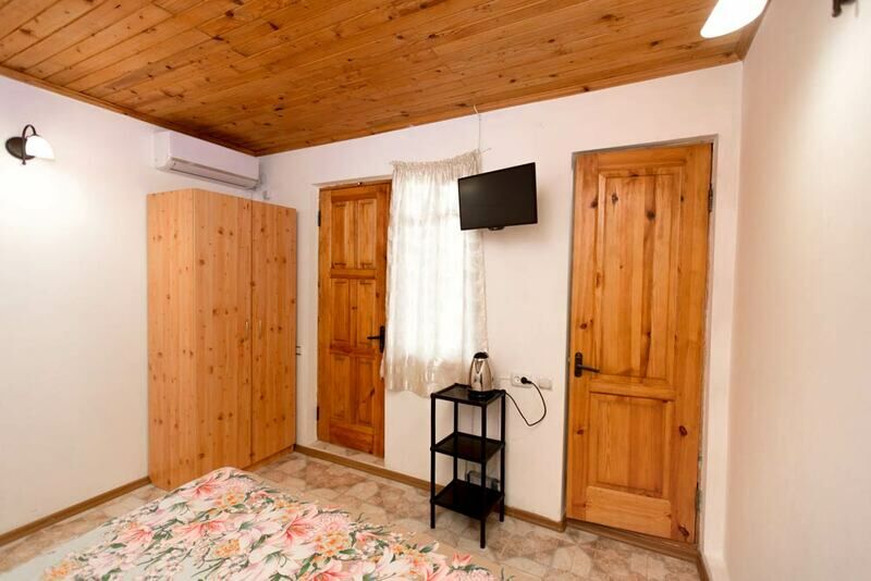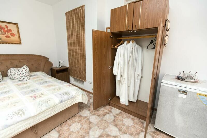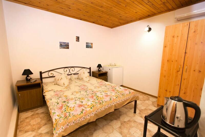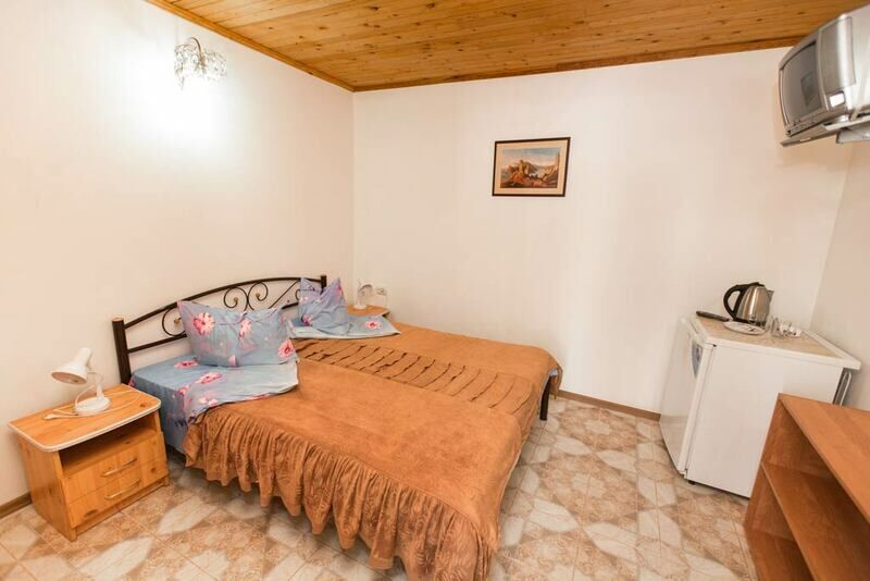 В номере: 2-х спальная деревянная кровать с ортопедическим матрацем, 2 тумбочки со светильниками, шкаф, банкетки, плазменный телевизор, холодильник, электрочайник и набор необходимой посуды (тарелки, стаканы, ложки, вилки). На территории есть WI-FI.