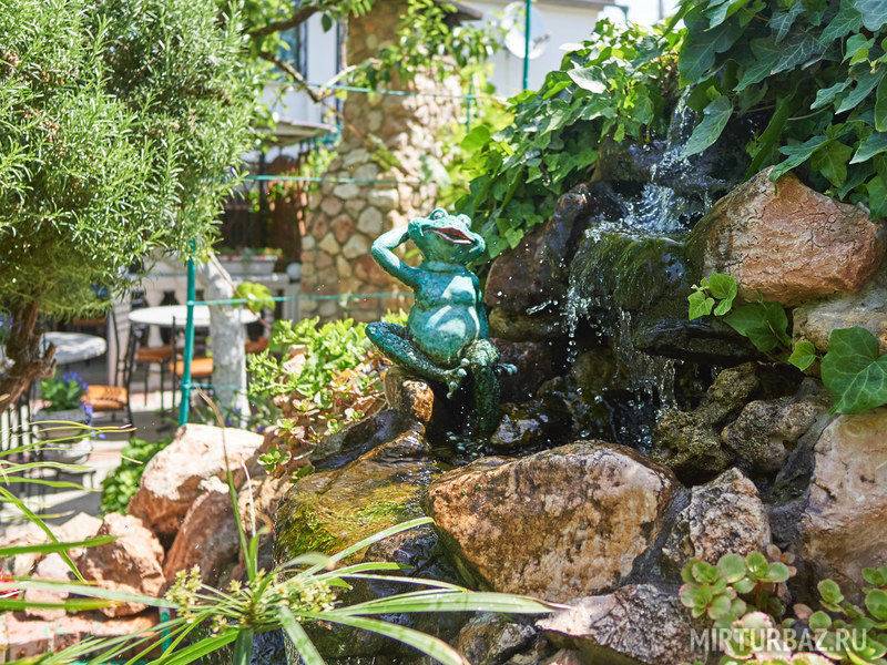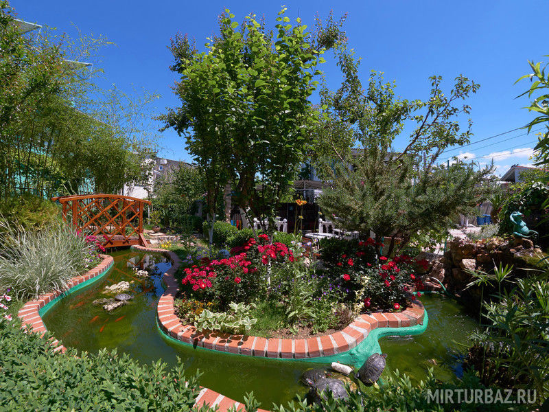 Территория оформлена хорошо, минифонтаны, водоемы с рыбами и черепахами, детям нравится, есть песочница с игрушками, игры для детей тоже имеются.