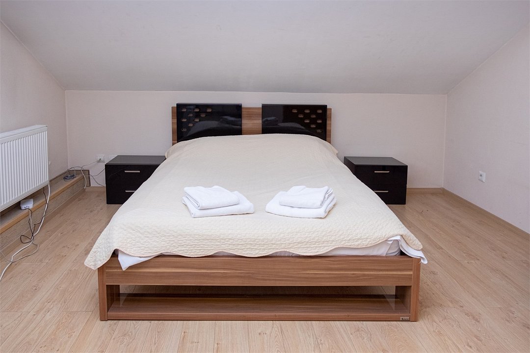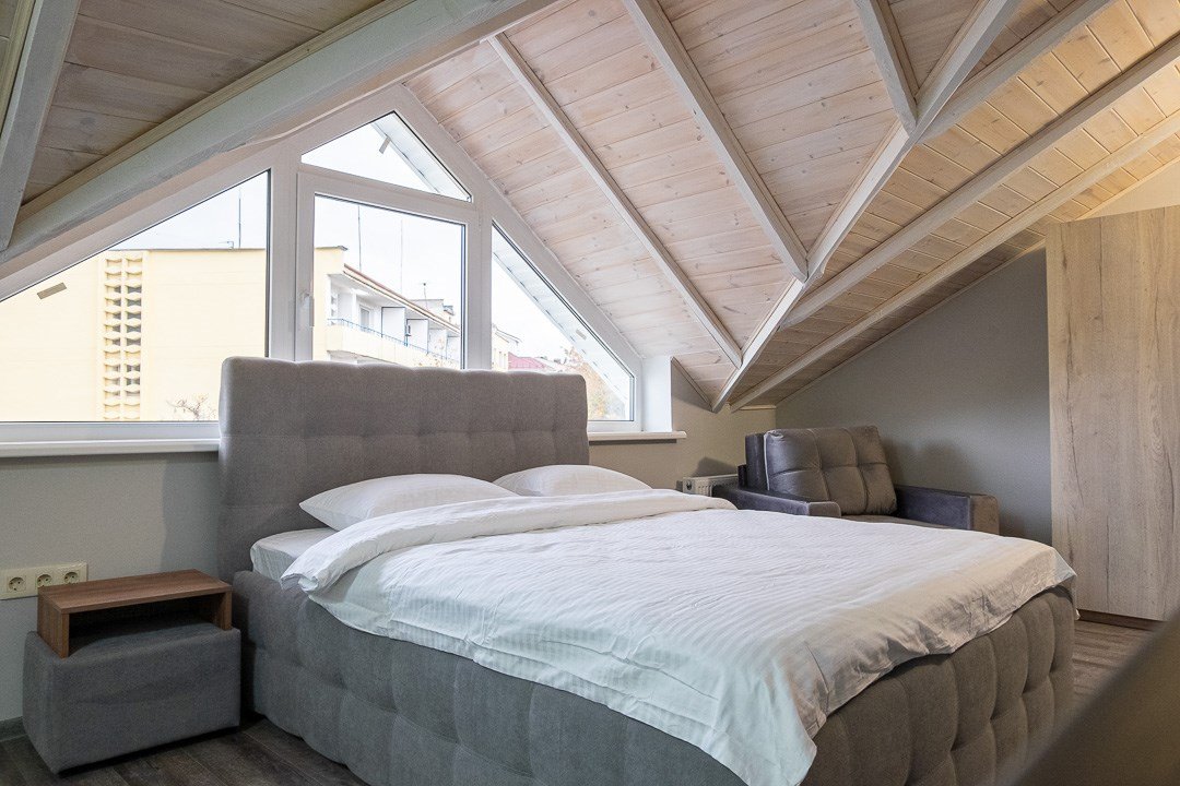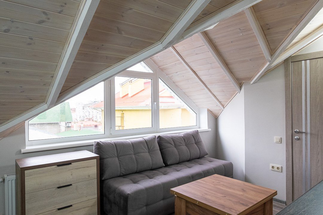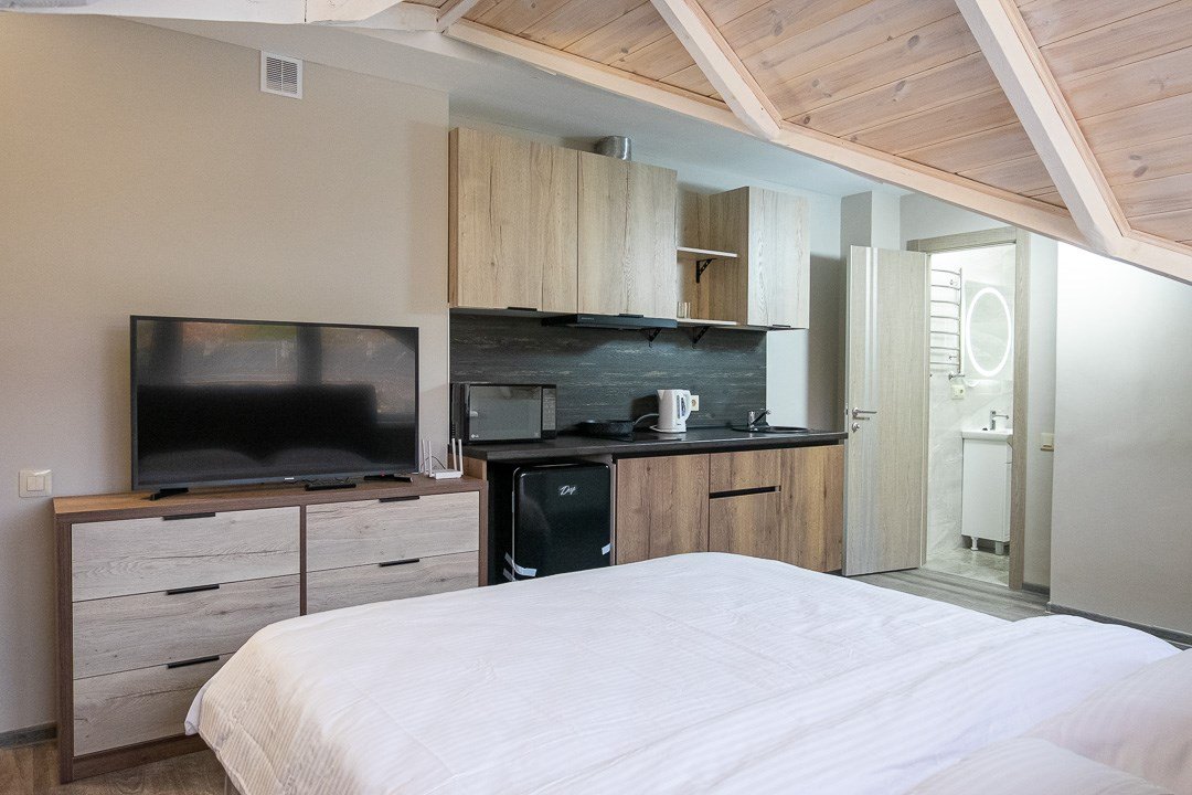 Просторные однокомнатные апартаменты 2022 года постройки, отлично подойдут для 3-4 гостей. В номере двуспальная кровать и диван. Ванна или душевая кабина. Есть кухонная зона с варочной поверхностью, холодильником, микроволновой печью и посудой. Апартаменты расположены на мансардном этаже.Услуги и удобства