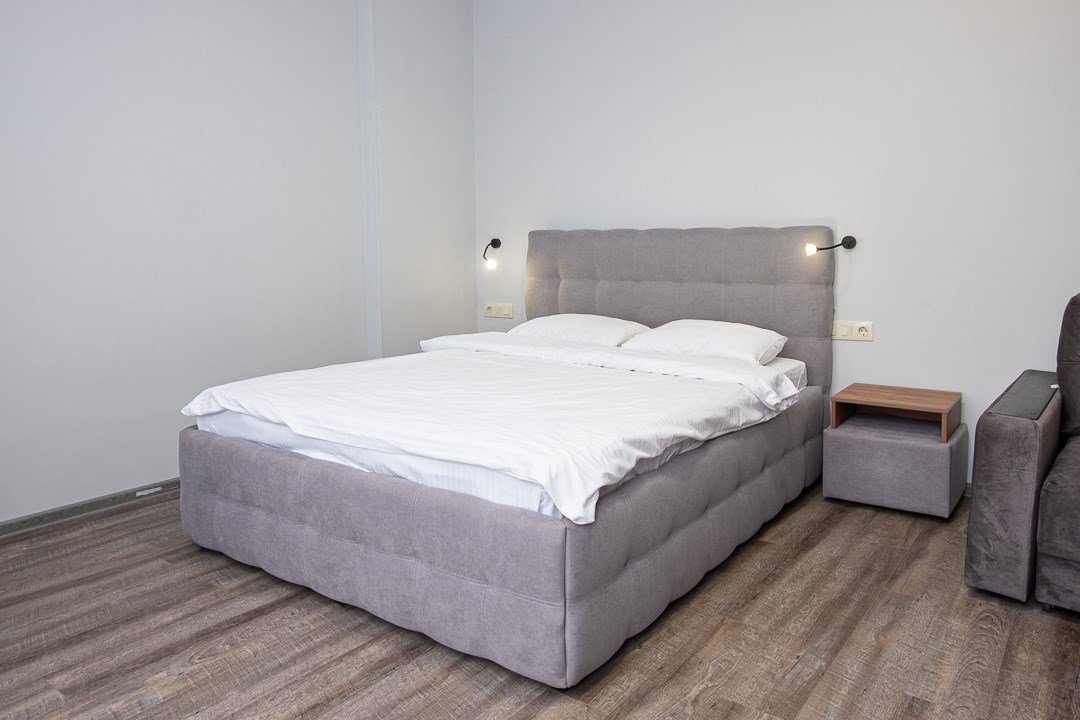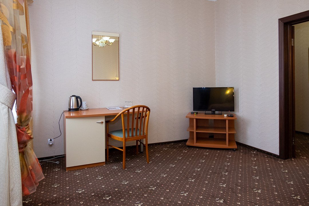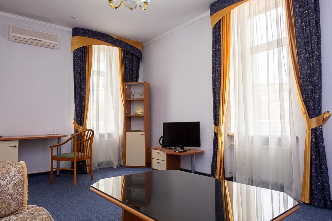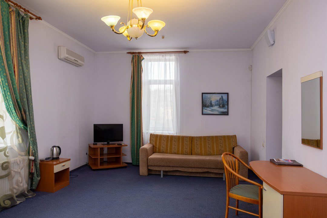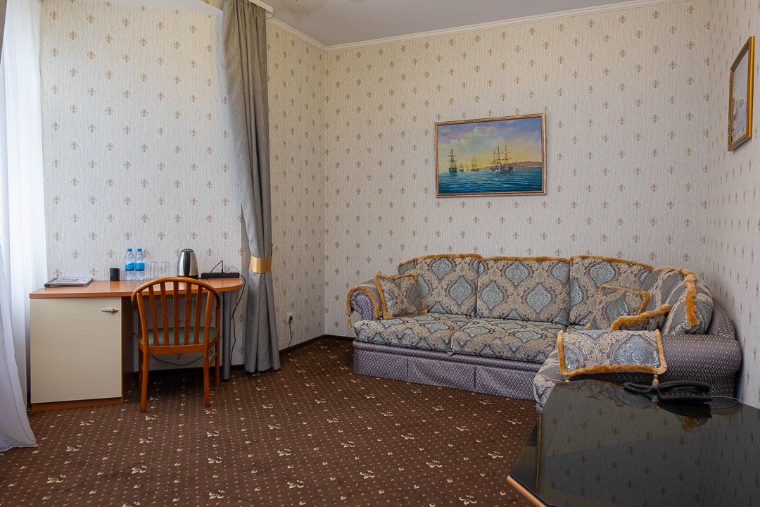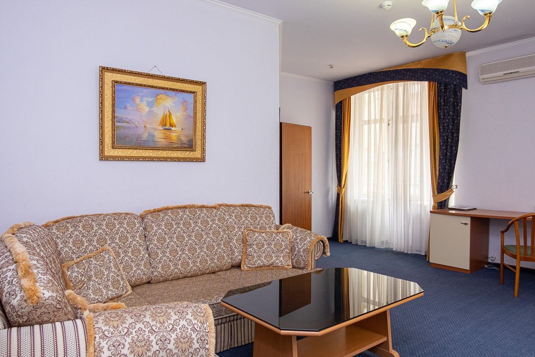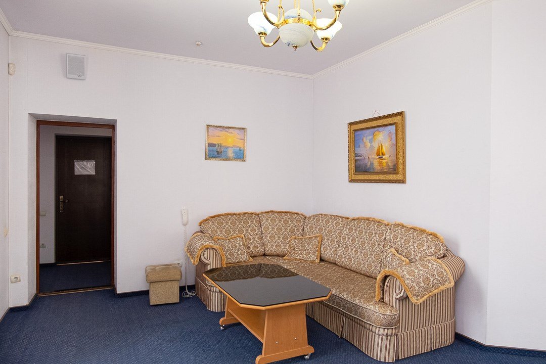 Просторный номер категории Люкс Плюс был обновлен в 2020 году и отлично подойдет для двоих гостей. Номер комплектуется двуспальной кроватью. В гостиной комнате есть диван. В ванной комнате все удобства, ванна или душевая кабина.Услуги и удобства