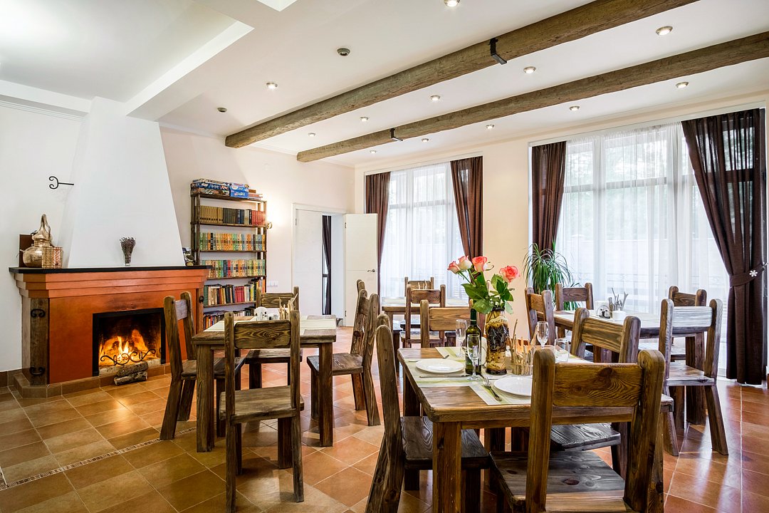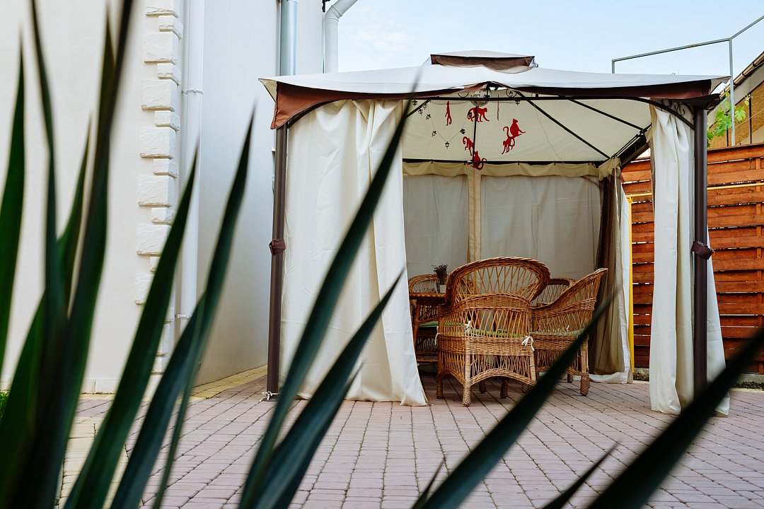 Для гостей на территории организована лаундж-зона с деревянными качелями, беседками и уличной кальянной. К услугам отдыхающих также баня, охраняемая парковка и беспроводной интернет, доступный на всей территории. А для детей организована игровая площадка с батутом.