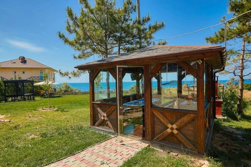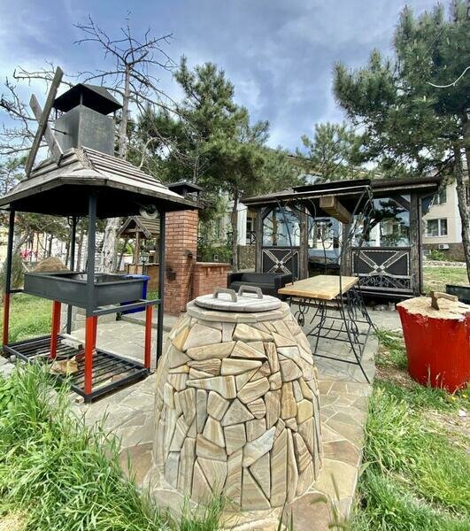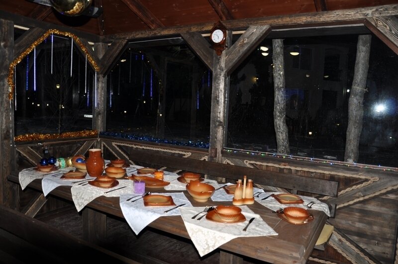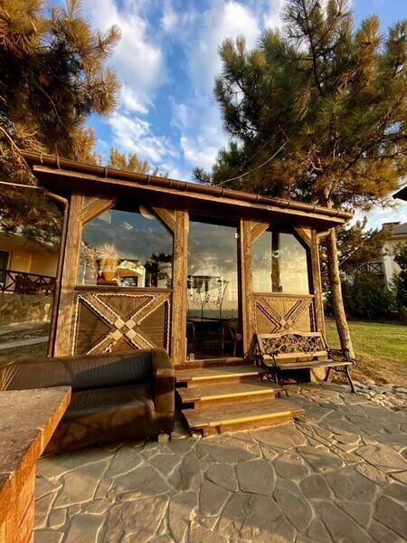 Здесь можно провести торжественное мероприятие или уютно расположиться компания друзей. Беседка с печью–камином вмещает до 14 человек. Внутри проведено телевидение, Wi–Fi, караоке, высококачественная глиняная посуда, несколько видов дров, шампура, при желании есть услуга персонального повара.