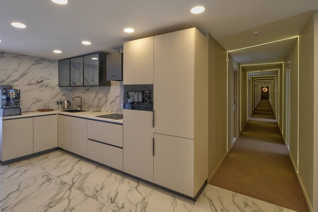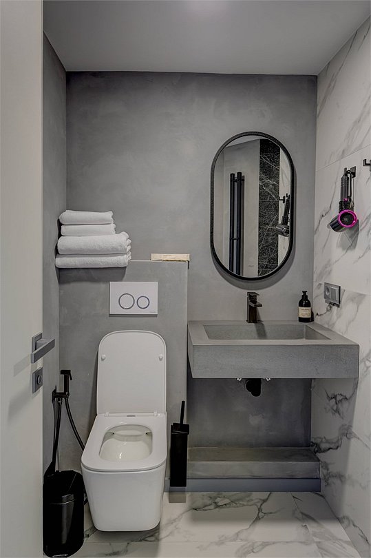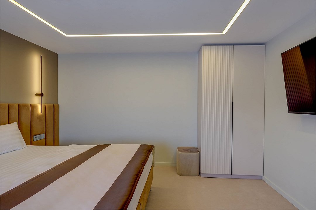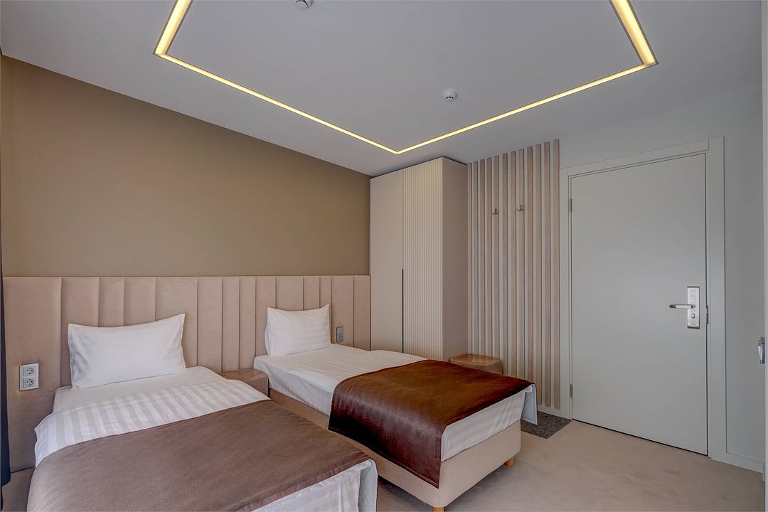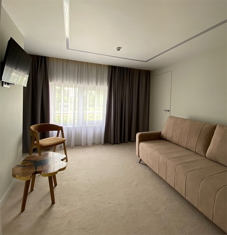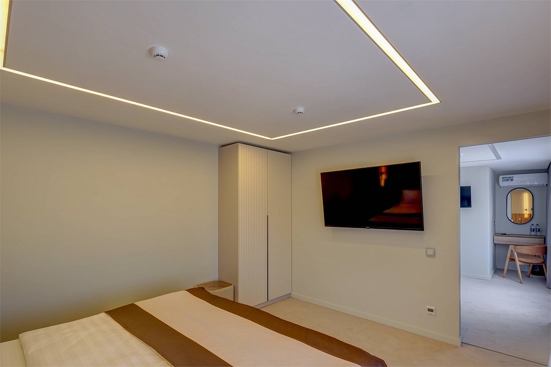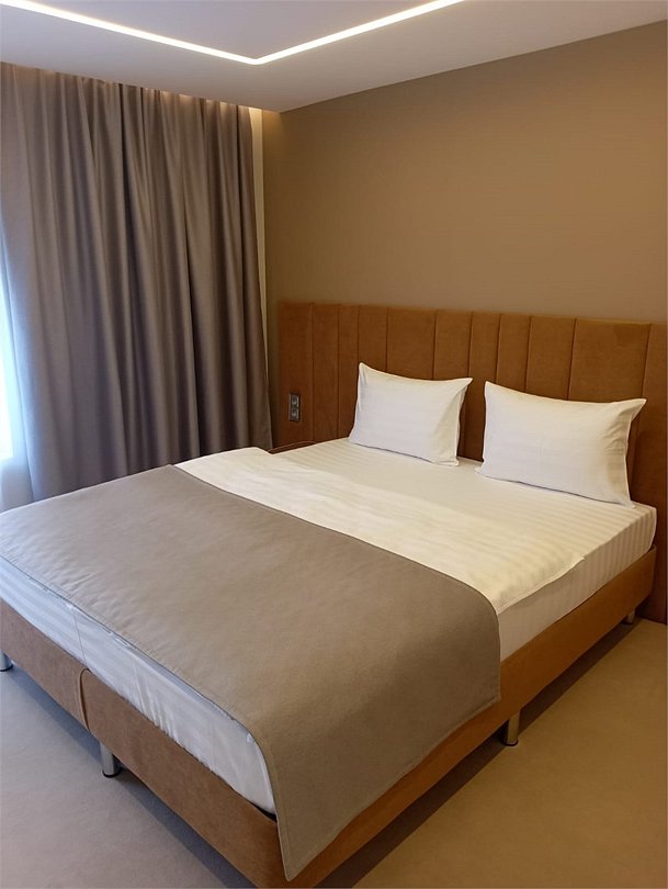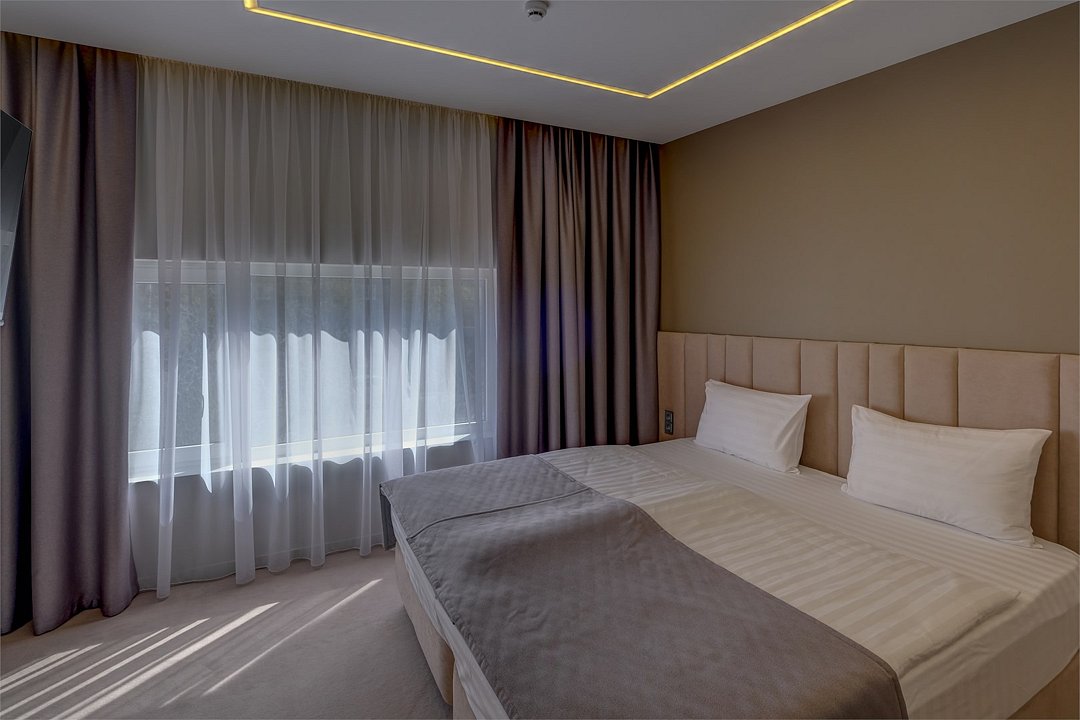 Двухкомнатный номер площадью 30 кв.м. оснащенный всем необходимым для комфортного пребывания в дали от дома : двуспальная кровать размера king size 180*200, диван, ТВ с плоским экраном, бутилированная вода, гладильные принадлежности ( по запросу), матрасы и белье Premium класса, халат, тапочки, гигиенические принадлежности для душа.Услуги и удобства
