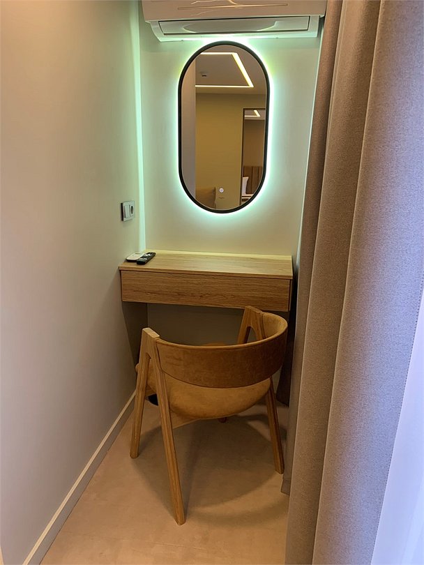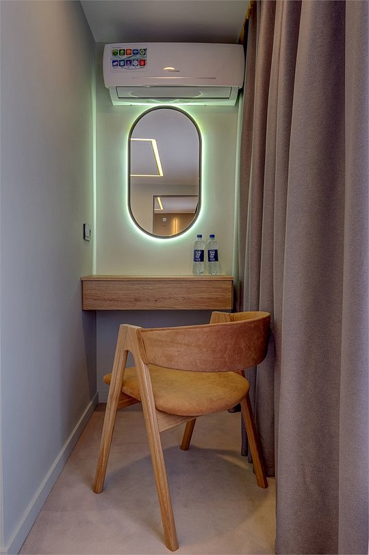 телевизор, Wi-Fi, кондиционер, светильник, фен, электронные замки, санузел, халаты, тапочки, кровать «King size», вешалки, зеркало, пуфики, ковер, унитаз, отопление, душ, вид во двор, стаканы, стул, цифровое тв, телевизор с плоским экраном, гостиничная парфюмерия, теплые полы, номер для некурящих, рабочий стол, чайная станция, уборка номера, услуги прачечной (платно), вешалки-плечики, бутилированная вода, шапочка для душа, мыло, затемняющая штора, дождевой и ручной душВ номере
