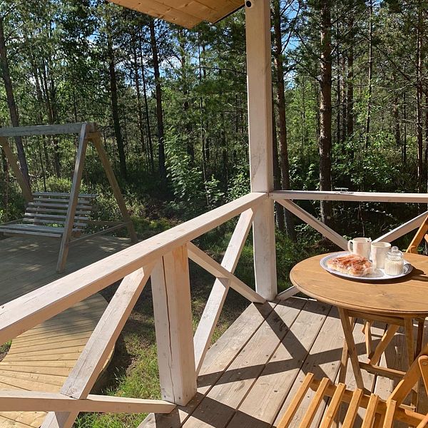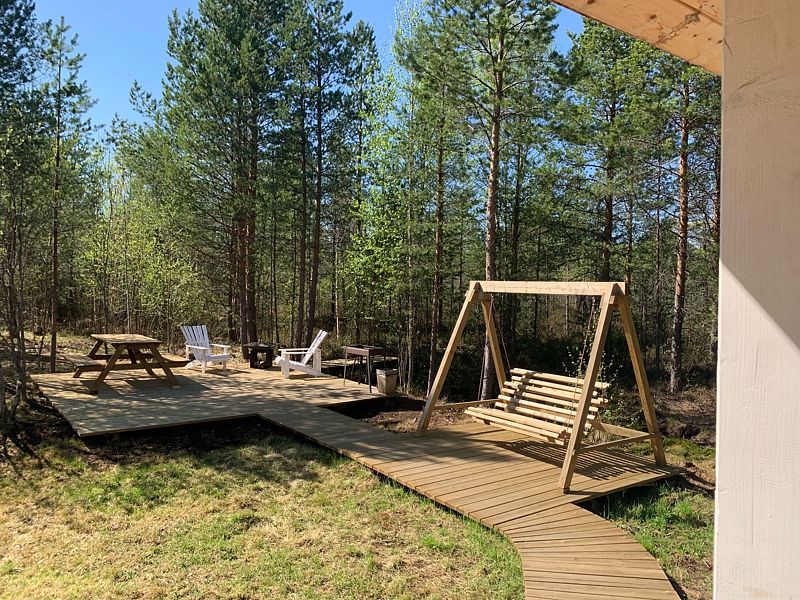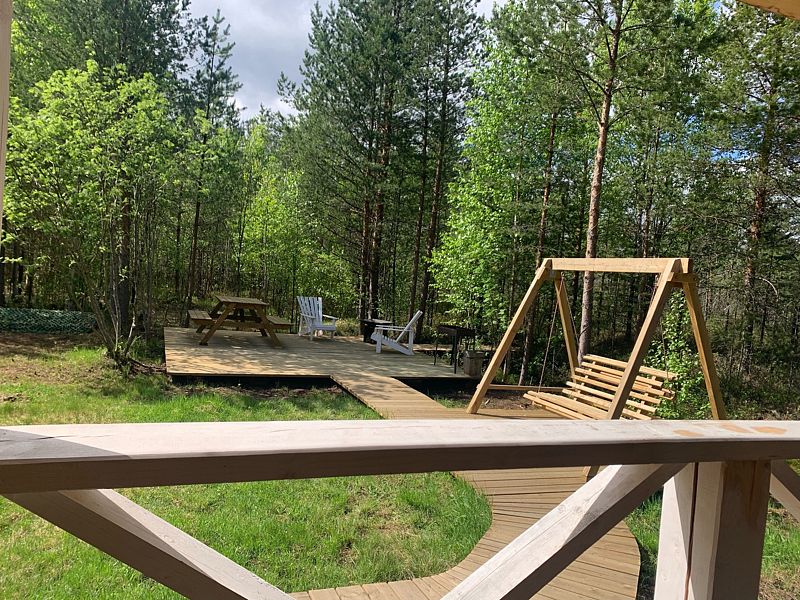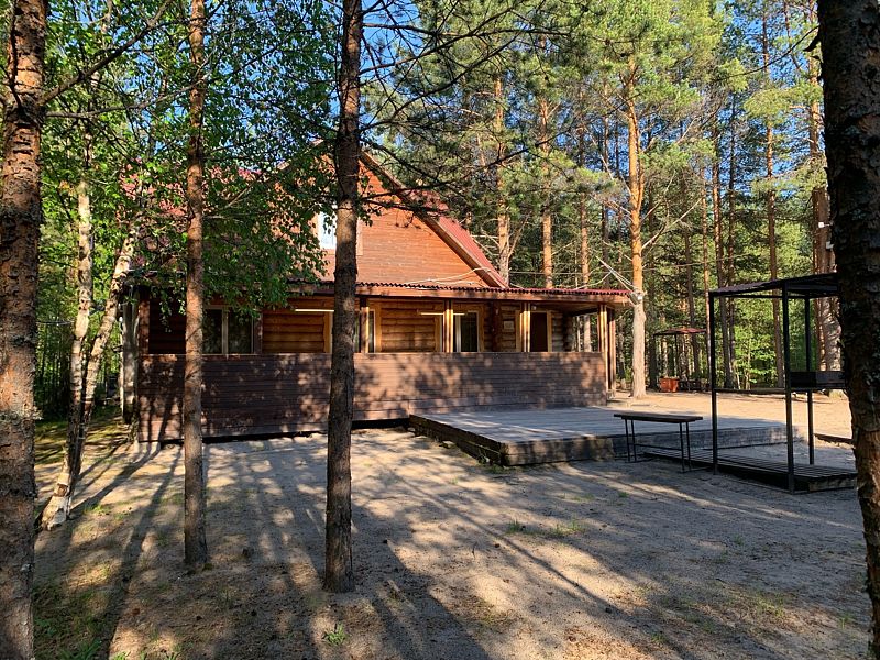 С террасы дома, оборудованной мебелью для отдыха, открывается панорамный вид на лес. Место очень атмосферное! На территории расположена деревянная качель, зона отдыха (мангал, шампура, костровая чаша, кресла для отдыха, стол и лавки), парковка для двух машин.