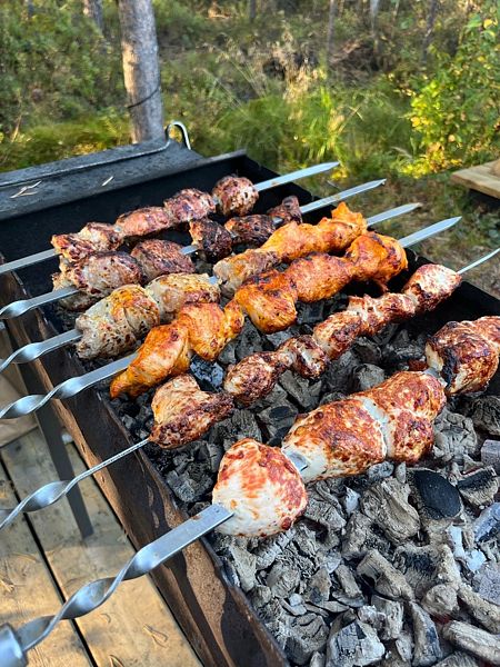 На свежем воздухе гостей ждет мангал под навесом с шампурами для приготовления барбекю.