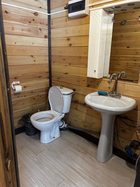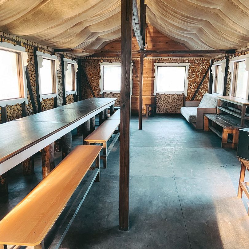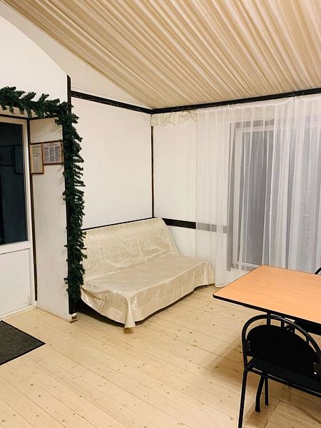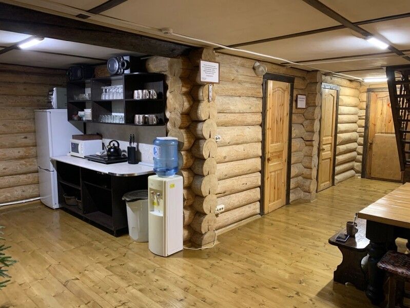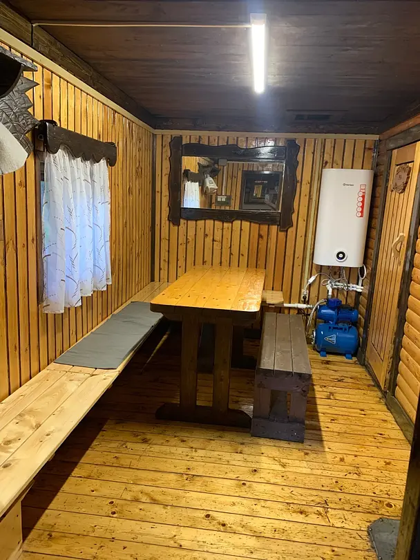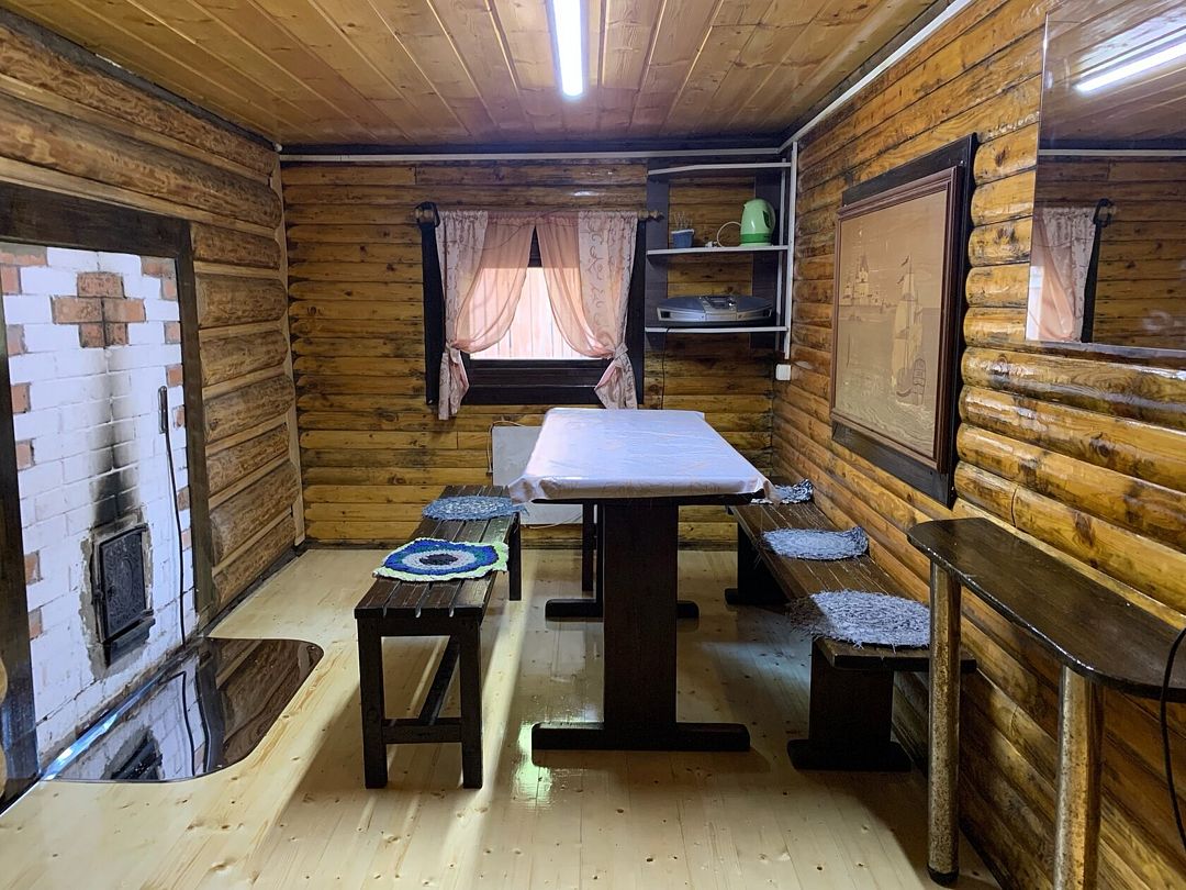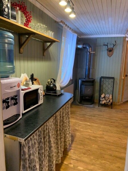 В зале кухонная зона: термопот, микроволновка, холодильник, отопление: температура зимой +19–21°С, санузел (теплая вода), диван, столы, стулья. На территории: мангальная зона.