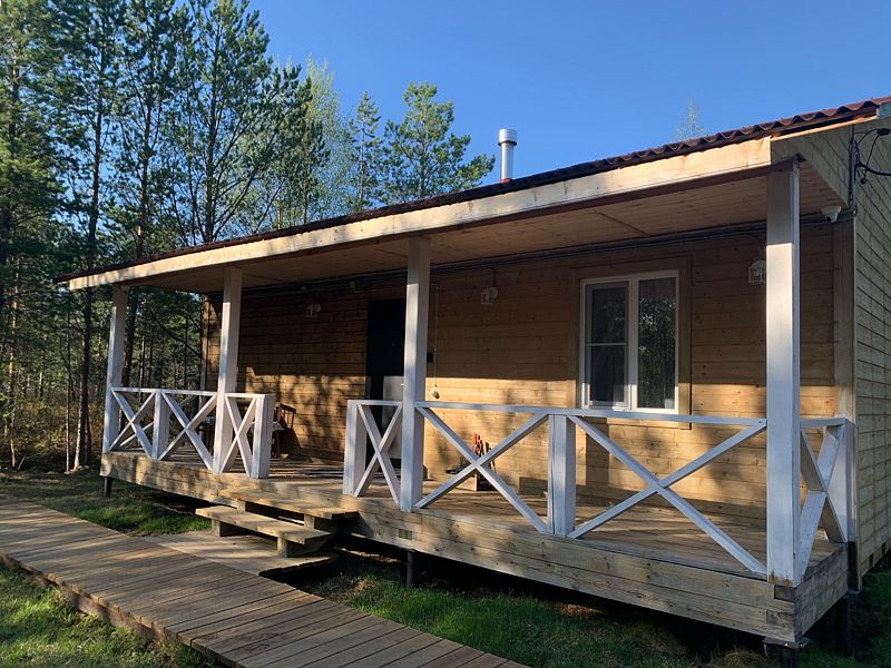 Коттедж пятьдесят квадратных метров — уютный дом из бруса, стилизованный под «Домик охотника», который расположен на базе отдыха в сосновом бору, на берегу реки Ширшема.