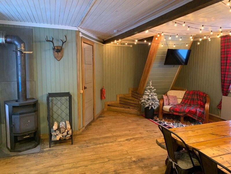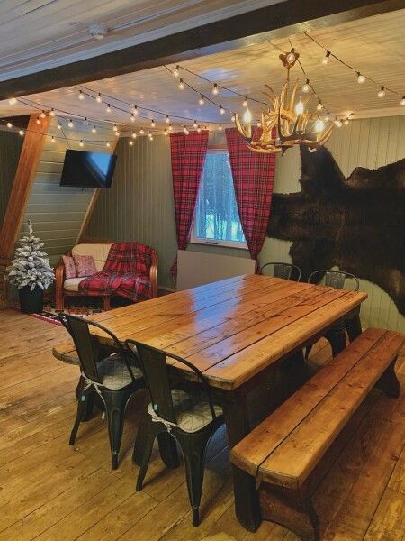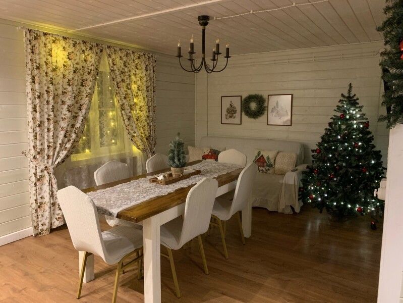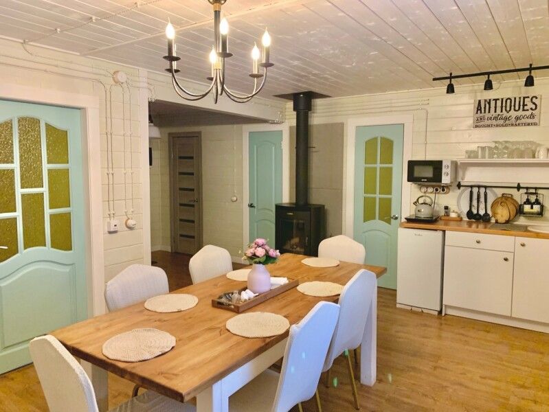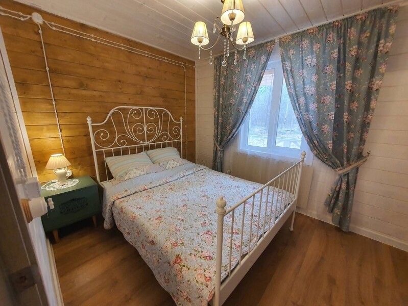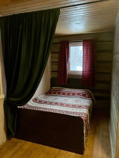 Первый этаж: гостиная с дровяным камином, кухня со всей необходимой техникой, посудой и питьевой водой, санузел (душа нет, есть баня), в столовой зоне вместительный стол до двадцати мест, три спальни. В каждой одна двуспальная кровать (постельное белье).