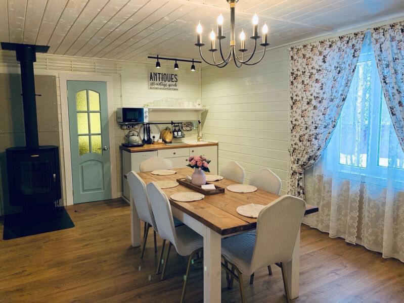 Первый этаж: гостиная с дровяным камином, кухня со всей необходимой техникой, посудой и питьевой водой, санузел (душа нет, есть баня), в столовой зоне вместительный стол до двенадцати мест, телевизор, музыкальный центр.