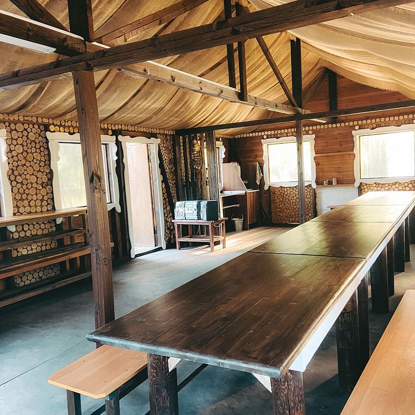 Просторная беседка, способная вместить до пятидесяти человек, уютно расположилась на живописном берегу реки, в самом сердце комплекса. Оснащенная мангалом под навесом, электричеством, микроволновой печью, чайником и рукомойником, эта беседка идеально подходит для отдыха и общения.