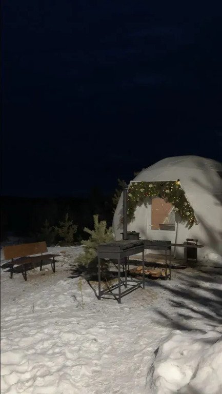 Проживание организовано в уютных домиках с панорамными окнами, из которых открываются завораживающие пейзажи. Для больших компаний создана необычная беседка-купол с камином и просторным столом — идеальное место для застолий и праздников в любое время года. Мангал позволит приготовить ароматные блюда на открытом огне, добавляя особый колорит отдыху.