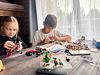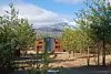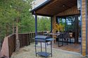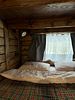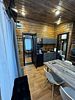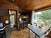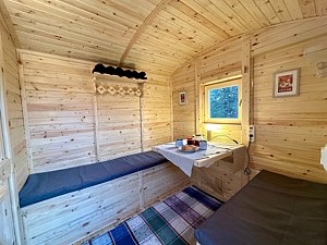 Обеденная зона располагает большим столом и стульями. Спальная зона представлена двуспальной кроватью на первом уровне и еще одной двуспальной кроватью на втором уровне. Каждый домик оборудован санузлом с душевой кабиной.