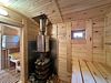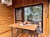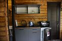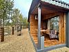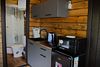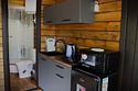 Домик площадью 15 квадратных метров с террасой. В домике есть все необходимое для комфортного пребывания: кухня с микроволновой печью, варочной поверхностью, холодильником, чайником, раковиной и всей необходимой посудой для приготовления.