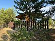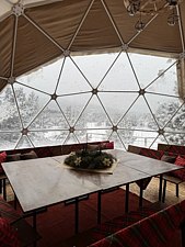 Гостей ждет уникальная беседка в форме купола, вмещающая до двадцати человек. Внутри расположены камин и большой стол, что создаёт атмосферу уюта, а панорамные окна позволяют наслаждаться великолепием природы.