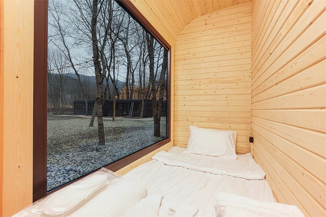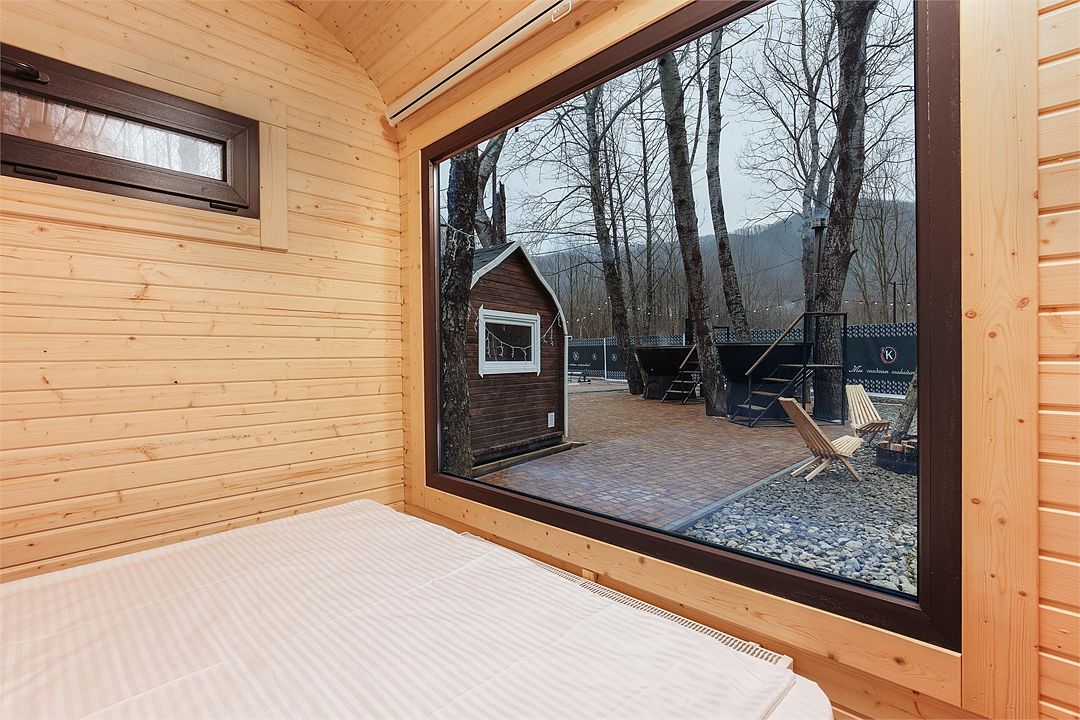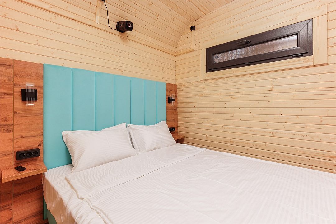 - Домики оборудованы премиальными кроватями Queen size, панорамными окнами, которые при желании превращаются в кинотеатр (каждый номер оснащен проектором).