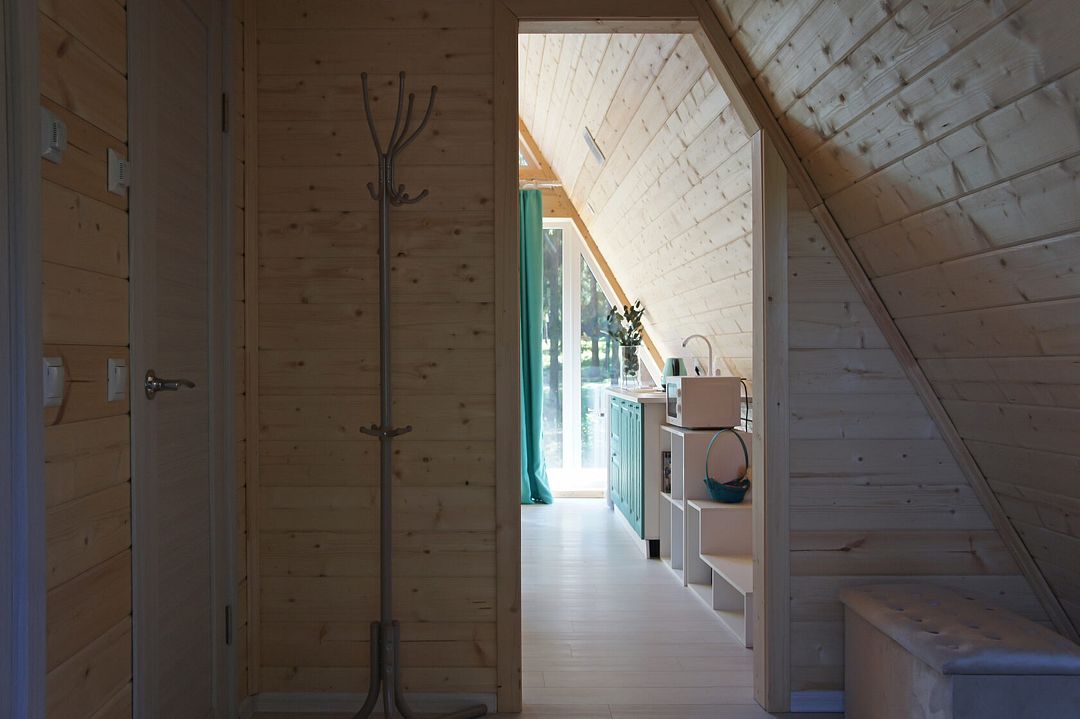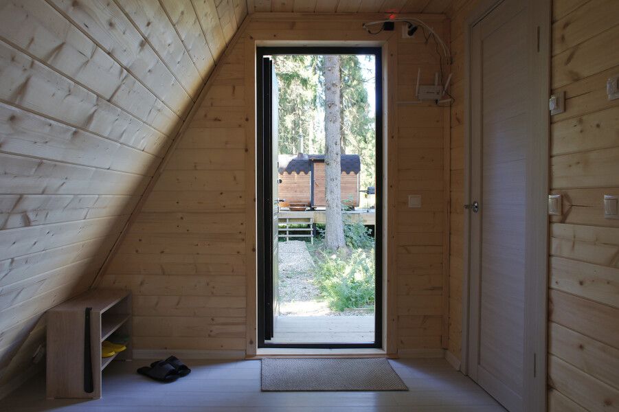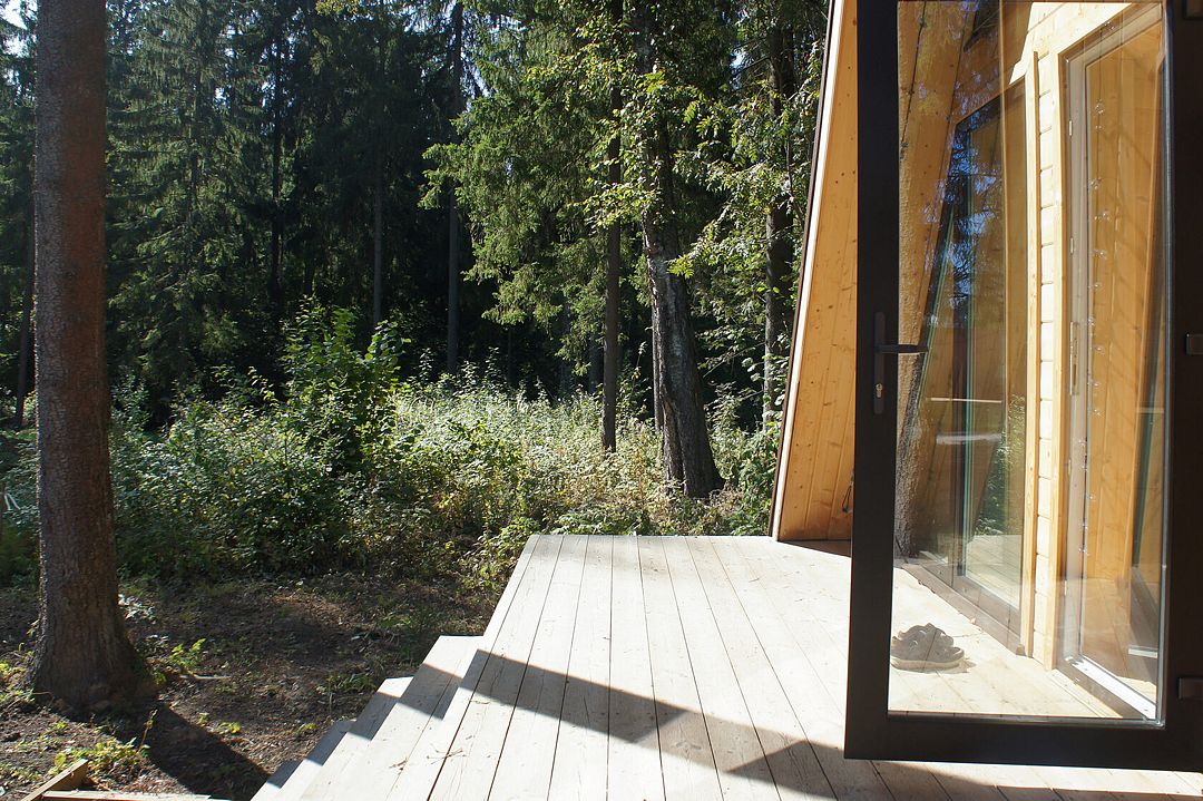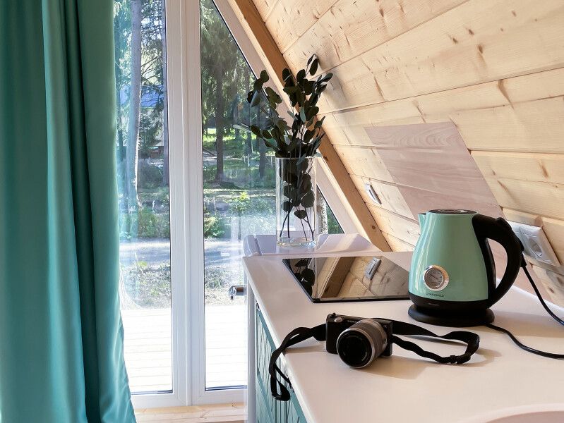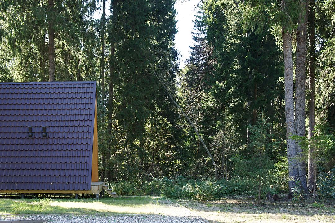 Комфортабельный А-фрейм рассчитан на проживание до 4 человек. В доме есть все необходимое для полноценного отдыха: белоснежное постельное бельё и махровые полотенца, посуда на 4 персоны, холодильник, встроенная электрическая плита, СВЧ-печь, чайник, ванные принадлежности, чай, кофе и специи. Лесной участок не огорожен, из окон и с террасы открывается вид на красивый лес. В холодную пору в доме комфортно благодаря полам с подогревом.