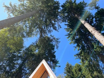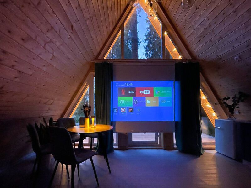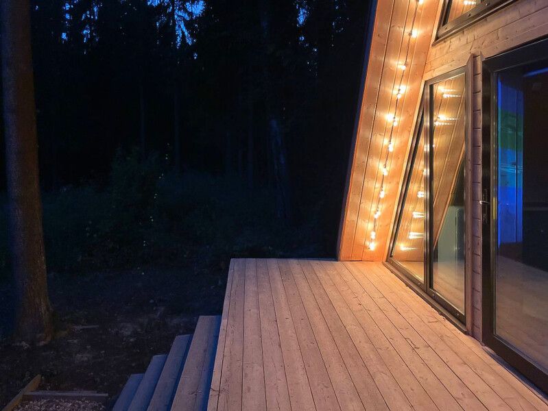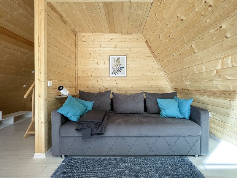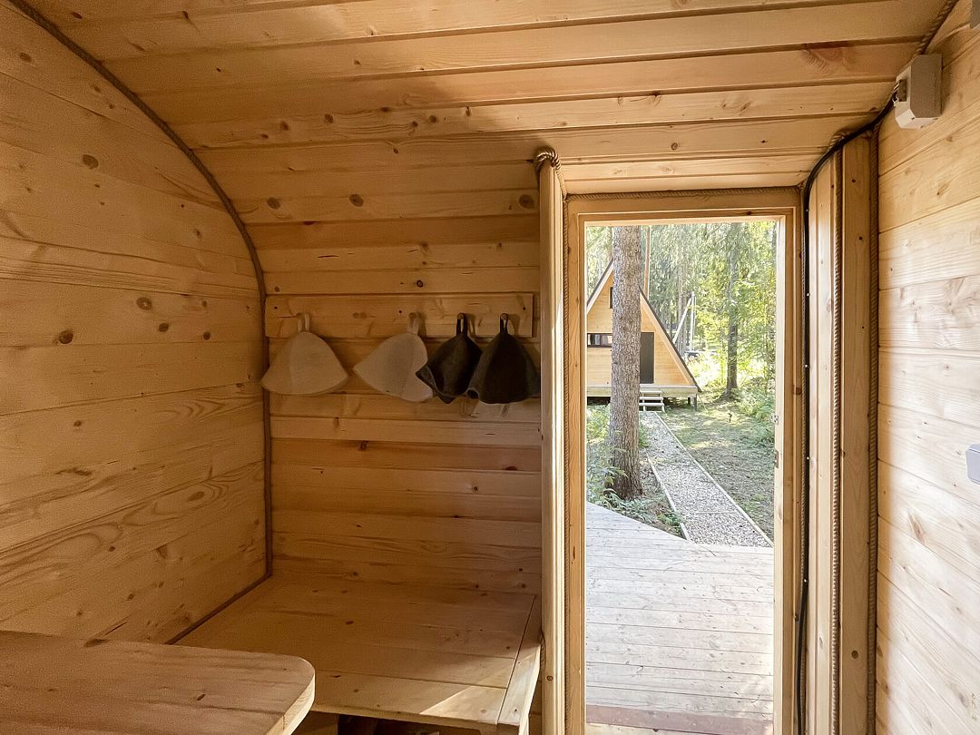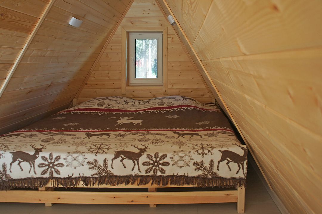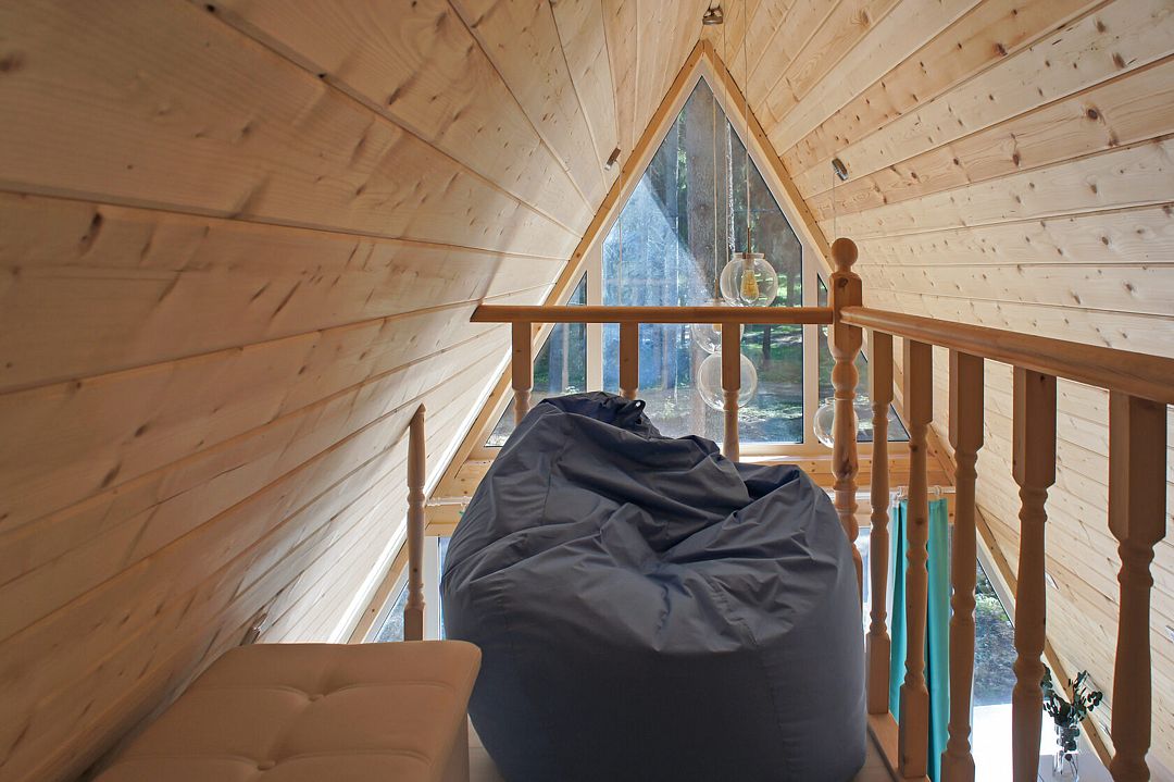 Комфортабельный А-фрейм рассчитан на проживание до 4 человек. В доме есть все необходимое для полноценного отдыха: белоснежное постельное бельё и махровые полотенца, посуда на 4 персоны, холодильник, встроенная электрическая плита, СВЧ-печь, чайник, ванные принадлежности, чай, кофе и специи. Лесной участок не огорожен, из окон и с террасы открывается вид на красивый лес. В холодную пору в доме комфортно благодаря полам с подогревом.