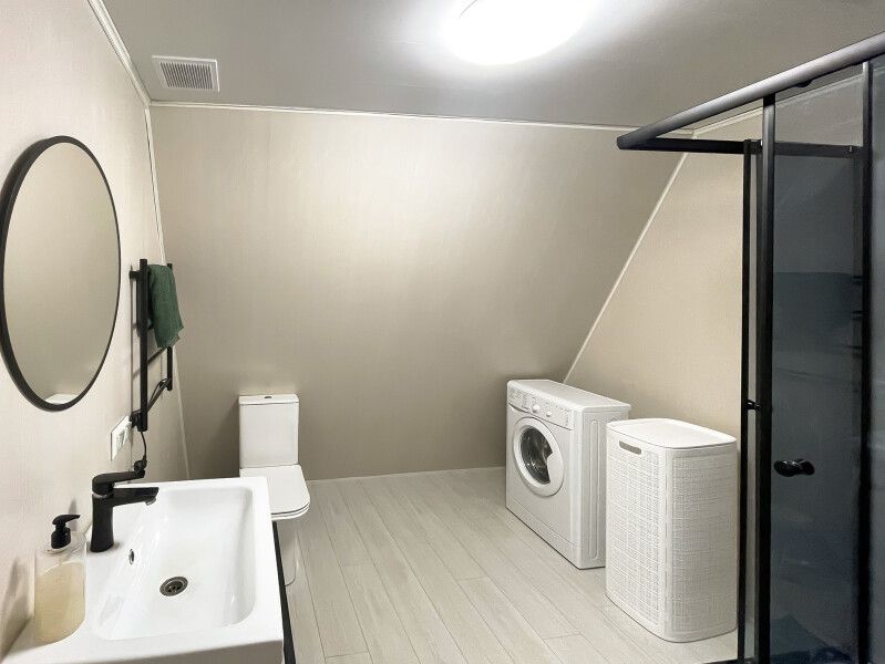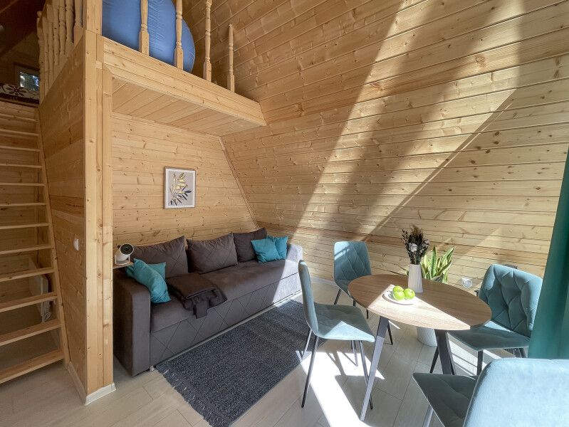 На втором этаже расположена двуспальная кровать. На первом этаже раскладной диван, кухня с необходимым набором посуды, обеденный стол со стульями, c/у с душем.