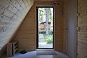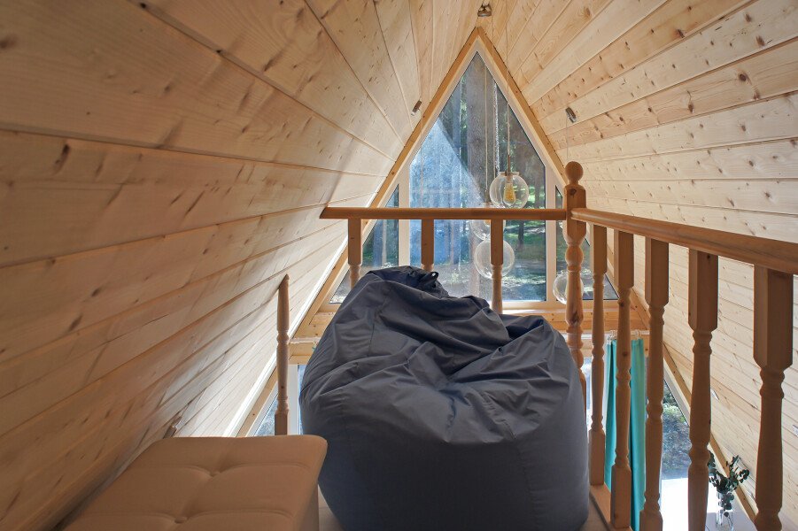 К размещению гостей предлагается уютный домик А-фрейм, вместимостью на 2 человека. Площадь 40 квадратных метров. На 2 этаже расположена двуспальная кровать King Size, на первом — раскладной диван. Самостоятельная организация питания возможна на полностью оборудованный кухне. Для этого есть мини-холодильник, электрическая плита, электрический чайник и полный набор посуды. Уютный дом-шалаш оснащен баней с купелью и проектором для просмотра любимых фильмов.