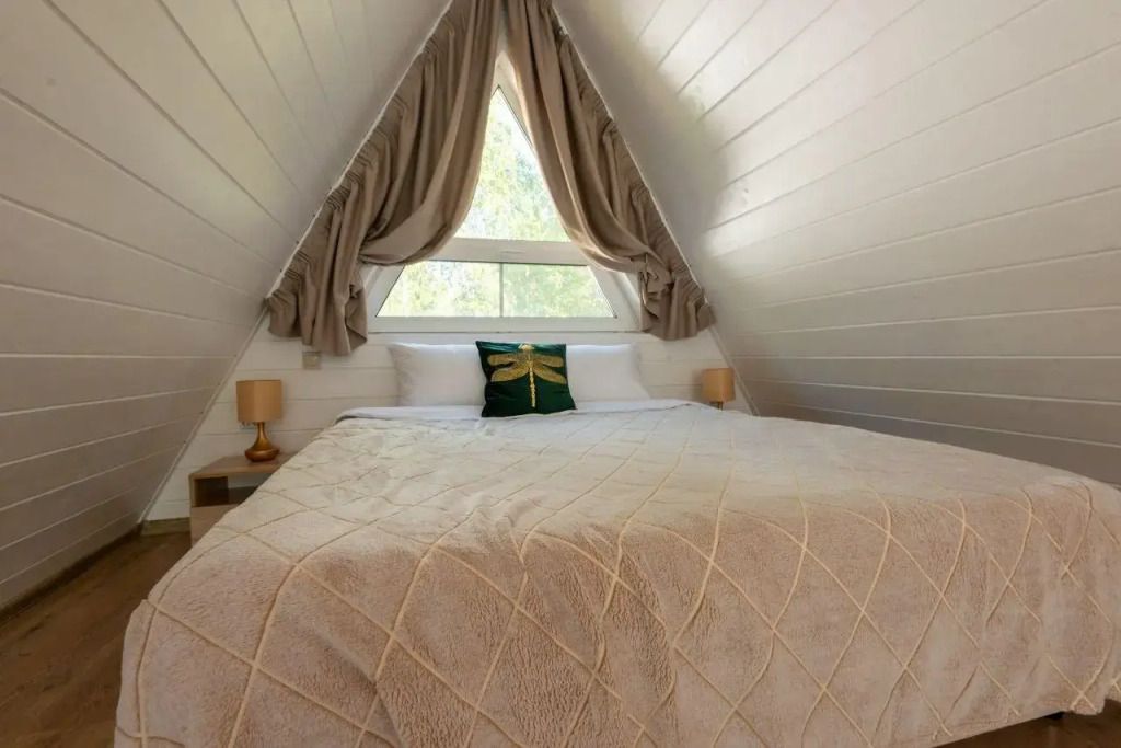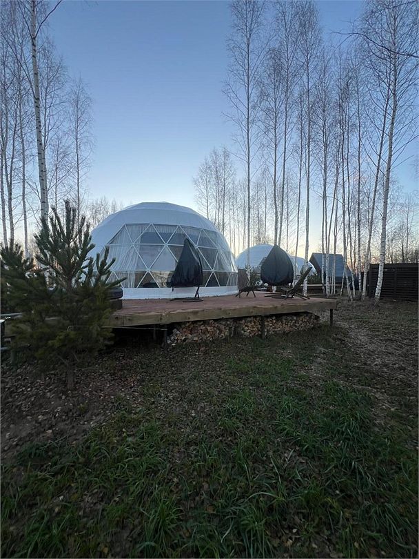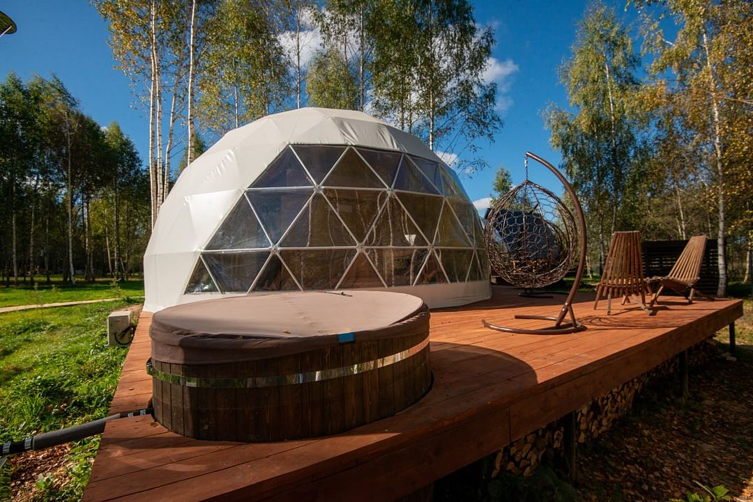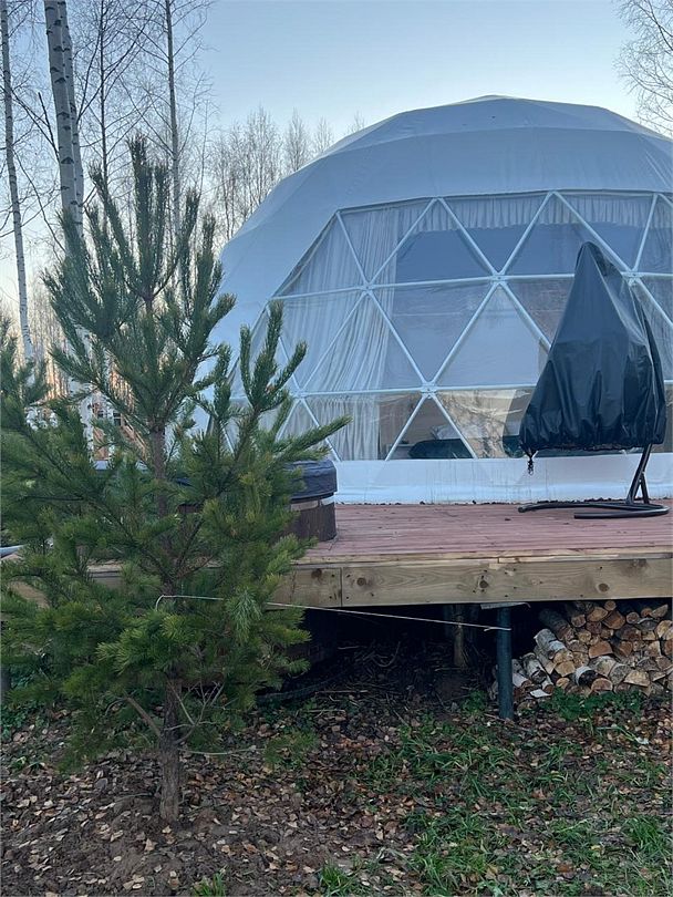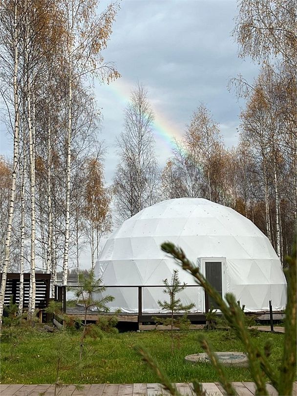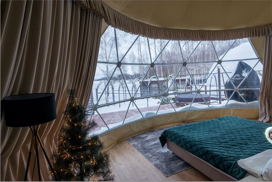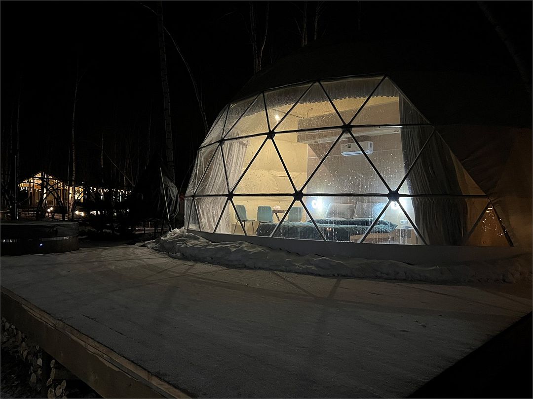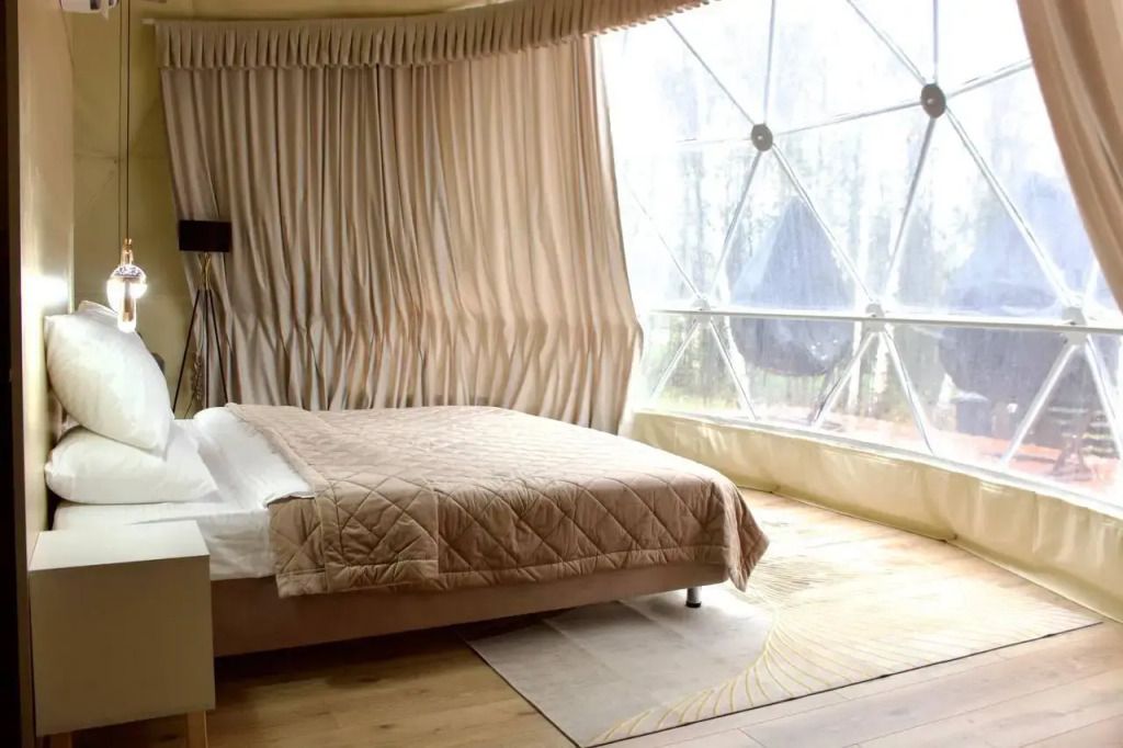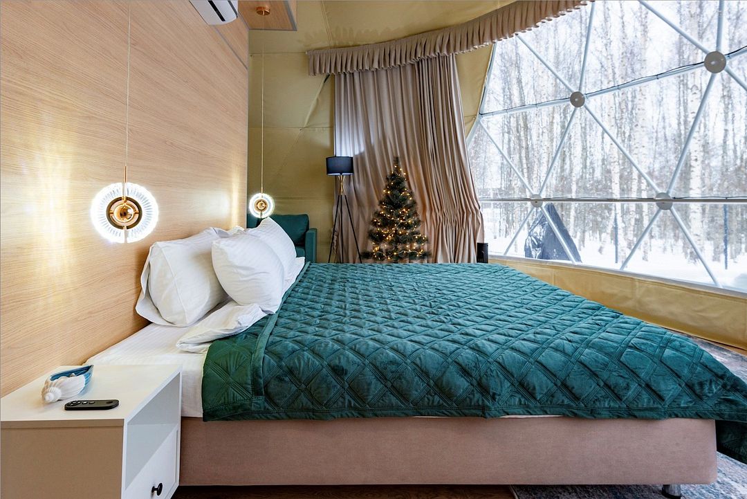 Купольный дом 8 метров диаметром, высота потолков 4,6 метра. Сфера-дом, оборудованный всем необходимым для отдыха и проживания. Кровать King Size у панорамного окна.