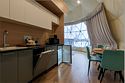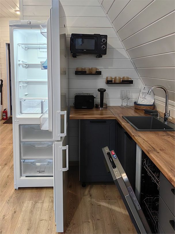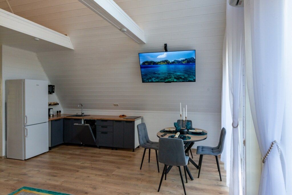 Кухня оснащена всей необходимой бытовой техникой (мини-холодильник с морозильной камерой, варочная панель, тостер, СВЧ, чайник), набор посуды для приготовления пищи, набор посуды для сервировки.