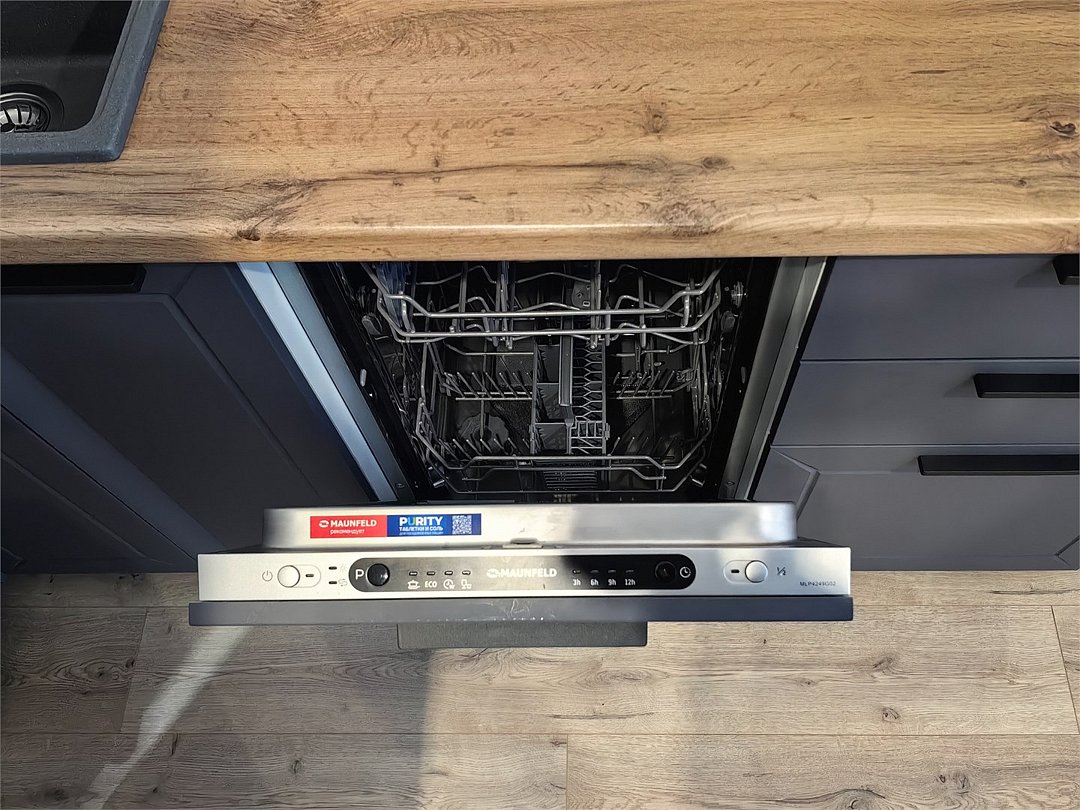 Полноценная кухня с посудомоечной машиной и холодильником.