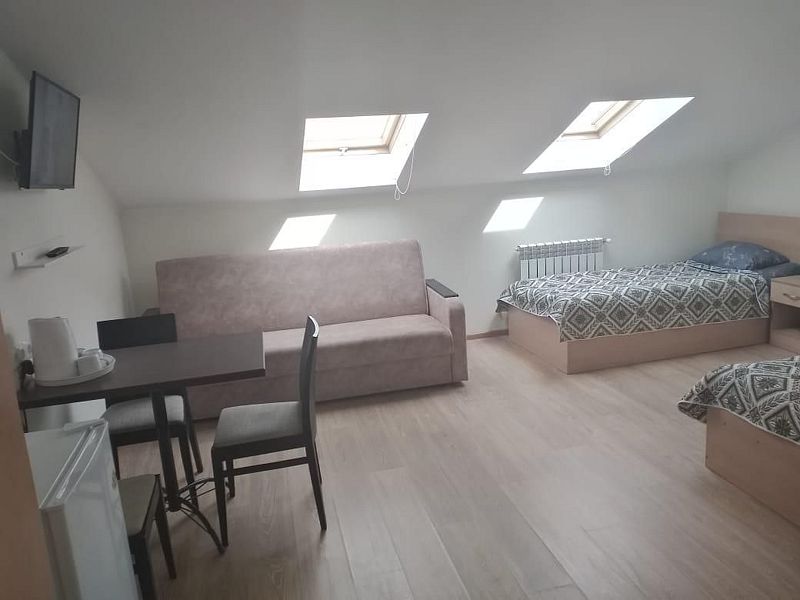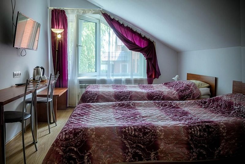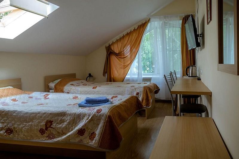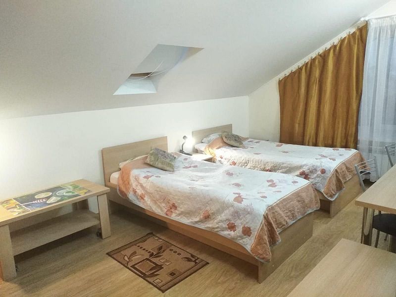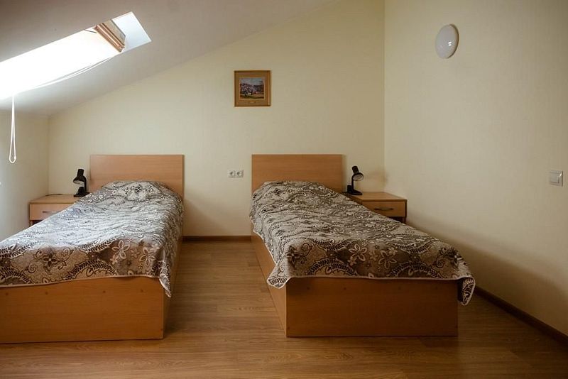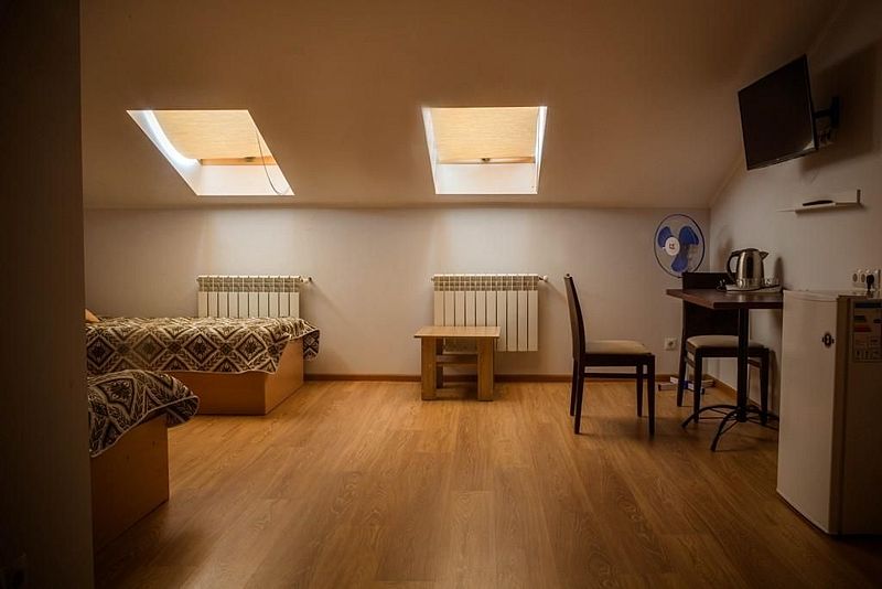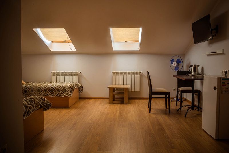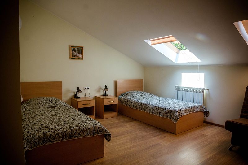 Двухместный номер с 2 кроватями 200x90 и холодильником, в этой комнате возможно размещение одного дополнительного места — раскладной кровати. Комната находится на 2-м мансардном этаже.