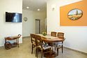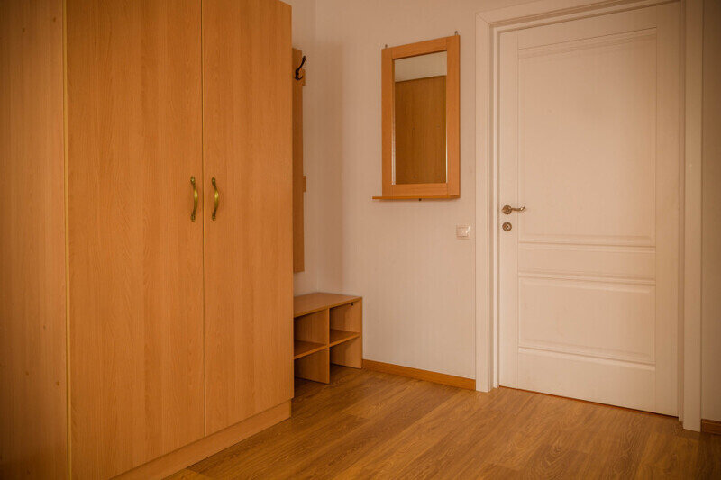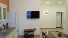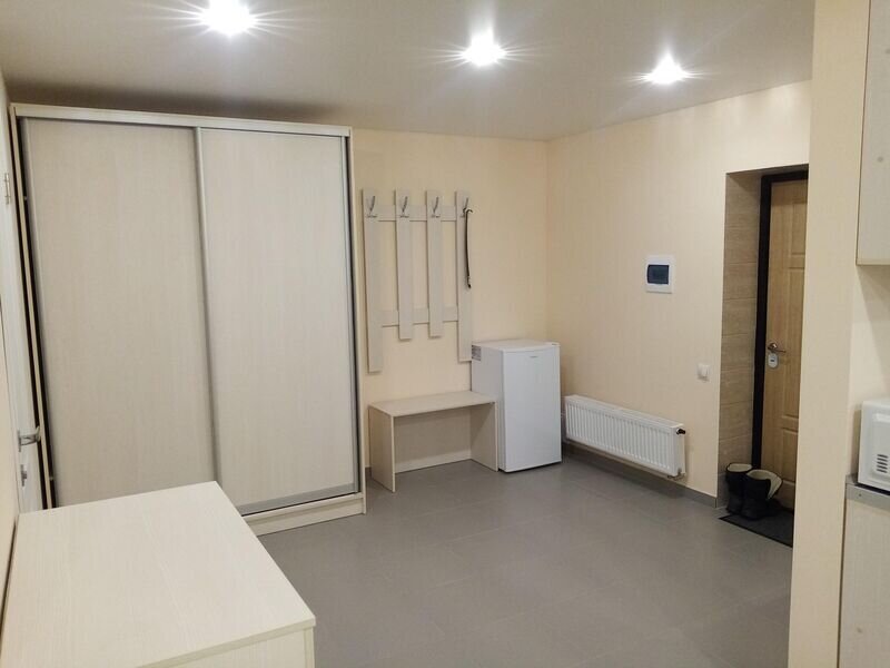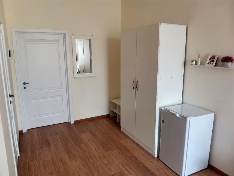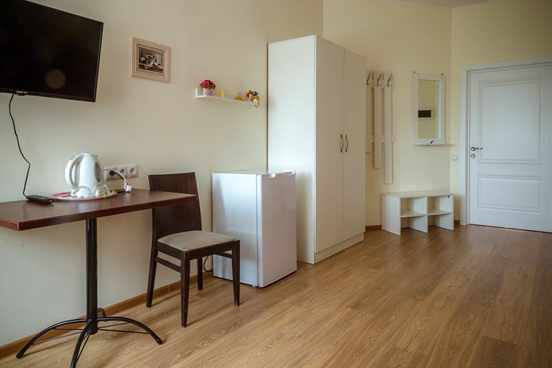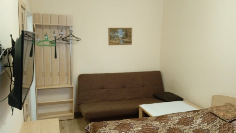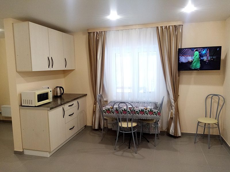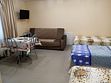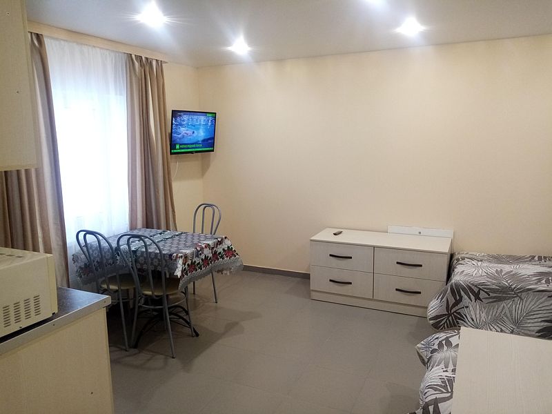 В спальне огромный зеркальный шкаф-купе, двуспальная кровать 160*200 и двуспальный раскладывающийся диван 140*190. В изолированной кухне есть всё необходимое для самостоятельного приготовления пищи. Есть собственная зона на общей веранде для отдыха на свежем воздухе. Номер находится на первом этаже.