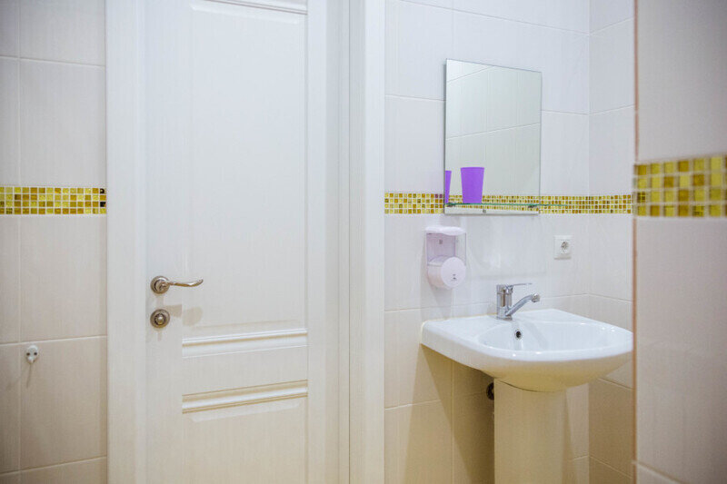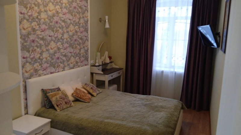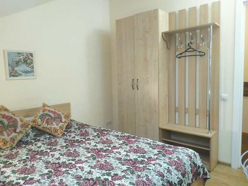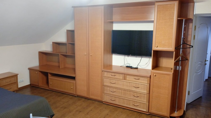 В одной спальне двуспальная кровать King-size 180*200 и раскладывающийся диван 130*190, во второй спальне двуспальная кровать 140*200. В каждой спальне свой телевизор. Санузел один, со входом из коридора. В этой квартире возможно размещение одного дополнительного места,— раскладной кровати. Находится на 3-ем мансардном этаже.