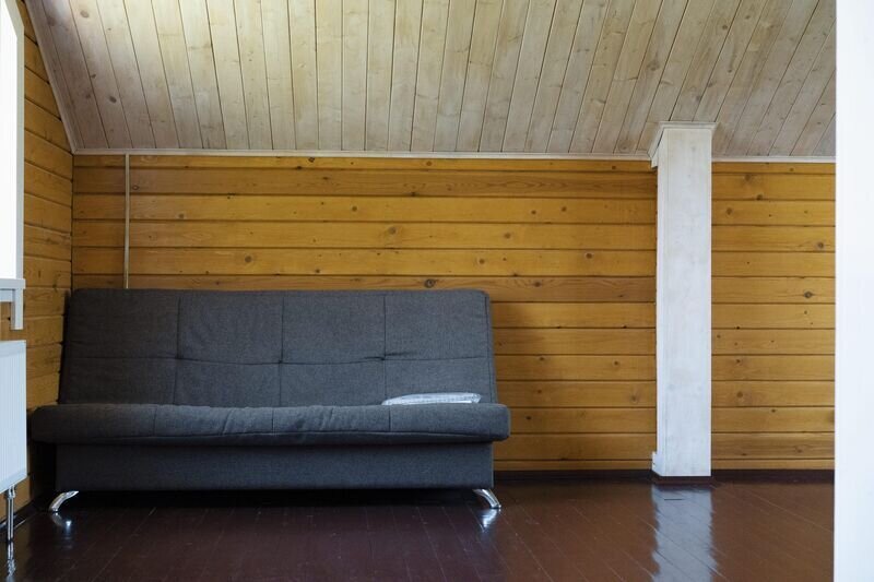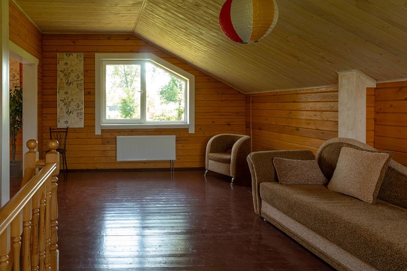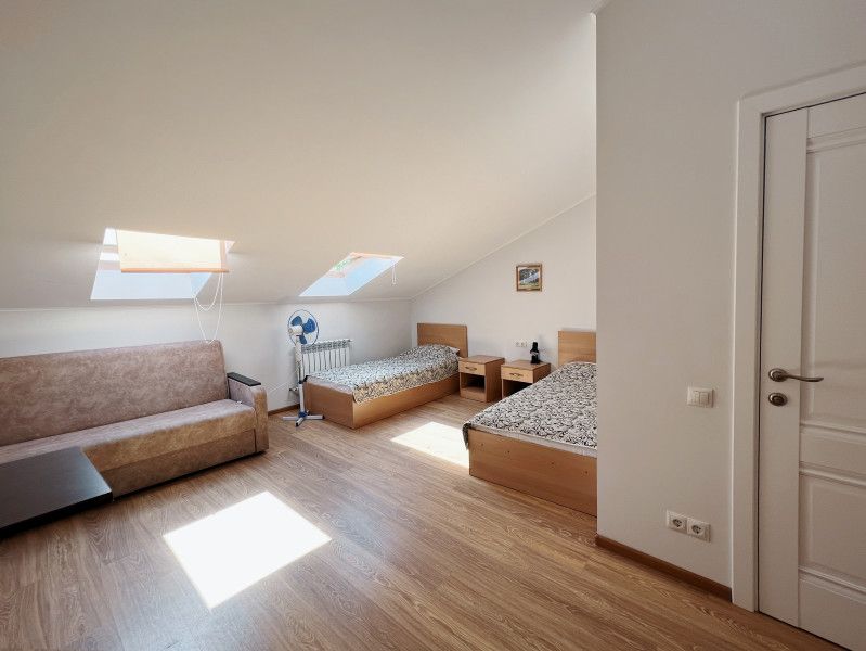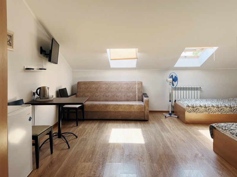 Четырехместная комната с 2 кроватями 90*200 и раскладывающимся диваном 130*190, находится на 2-м мансардном этаже.