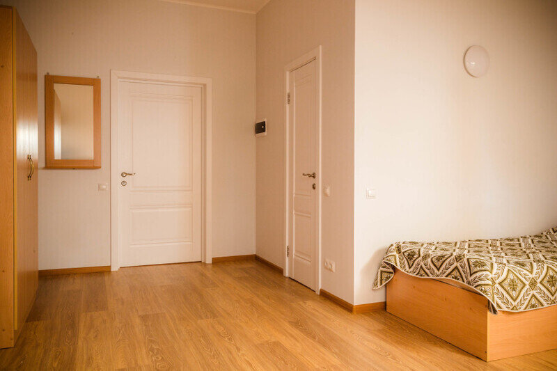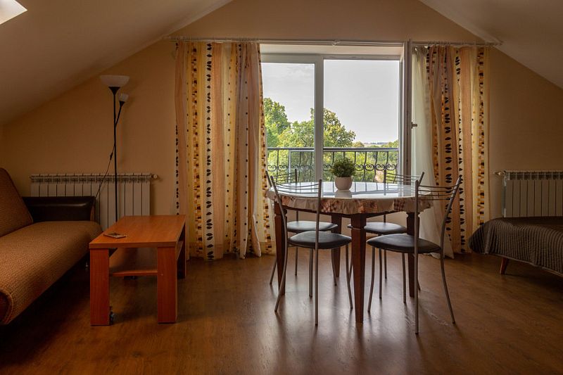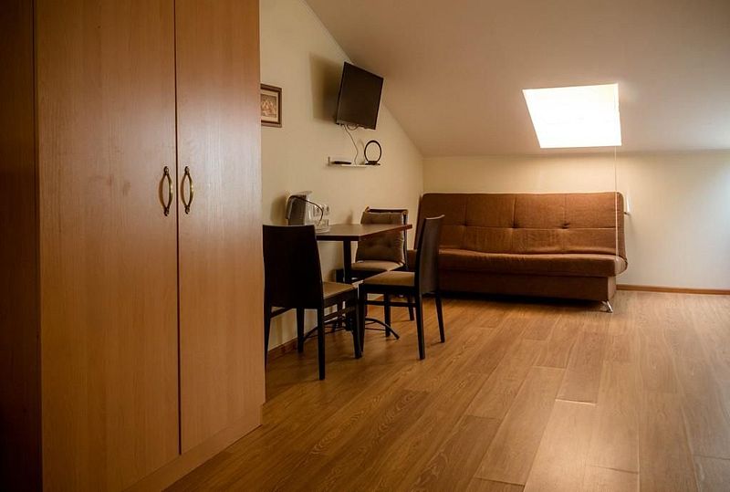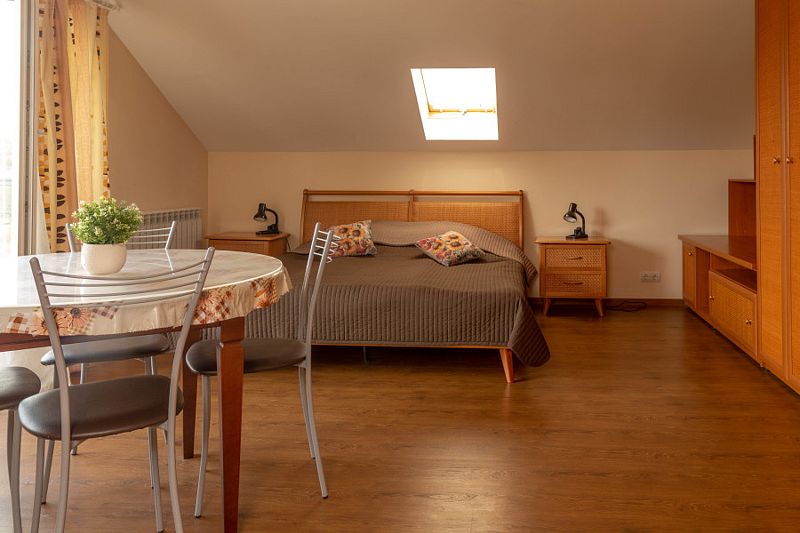 Двухместная комната с 2 кроватями 90x200, и в этой комнате возможно размещение одного дополнительного места — раскладной кровати. Две такие комнаты находятся на 1-м этаже, и две — на 2-м, мансардном этаже.