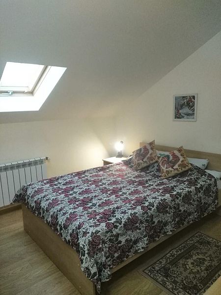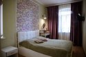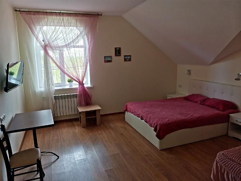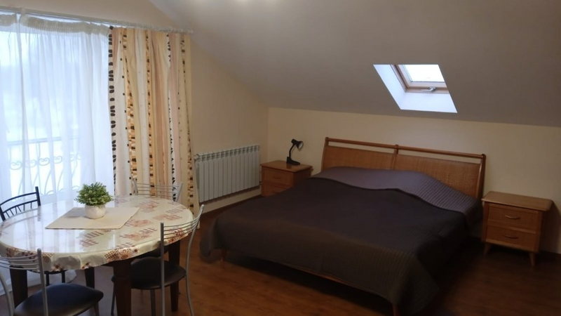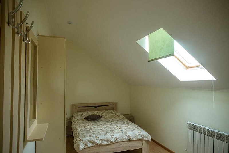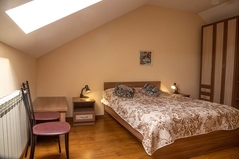 Двухместная комната с одной двуспальной кроватью 140*200. Две такие комнаты находятся на 1-м этаже, и две, — на 2-м, мансардном.