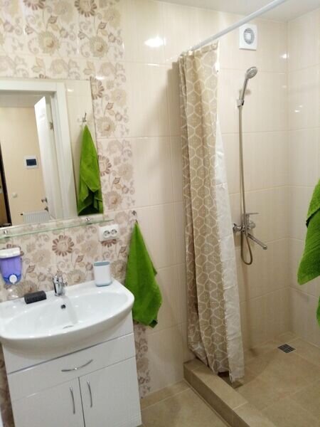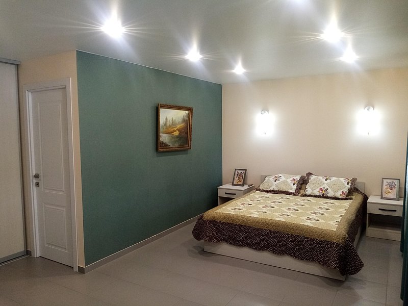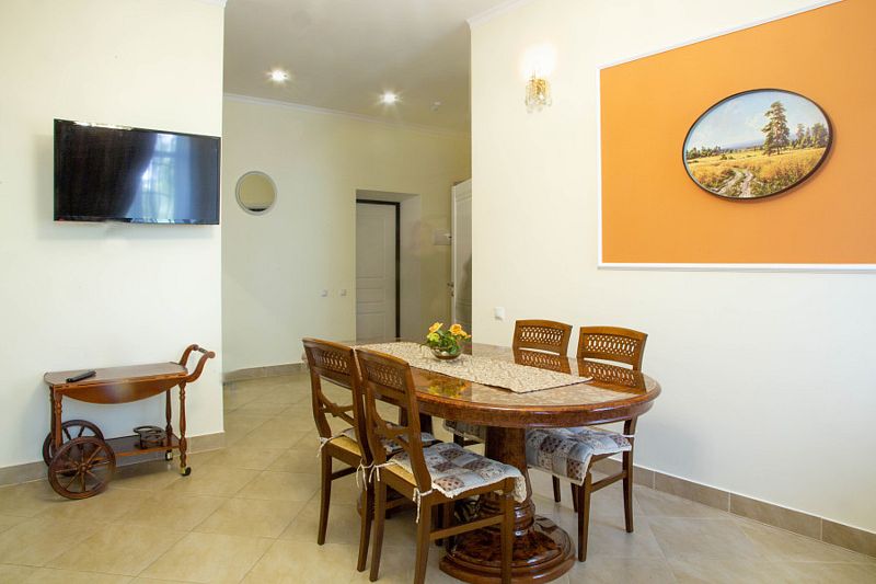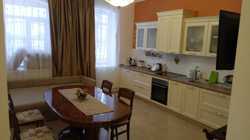 В спальне большой шкаф-купе и двуспальная кровать 160*200, телевизор. туалетный столик. В просторной гостиной собственная кухня со всей необходимой техникой и посудой для самостоятельного приготовления пищи, огромный обеденный стол, раскладывающийся диван 140*190, телевизор. В коридоре вместительный шкаф-купе. Квартира находится на 1-м этаже. Номер находится на первом этаже.