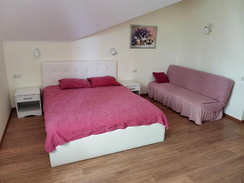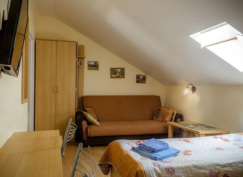 Трехместная комната с одной двуспальной кроватью 160*200 и раскладывающимся диваном 110*190, находятся на 2-м мансардном этаже.