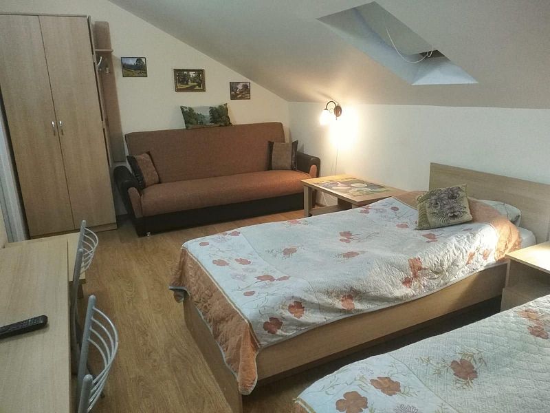 Трехместная комната с двумя односпальными кроватями 90*200 и раскладывающимся диваном 110*190, находится на 2-м мансардном этаже.
