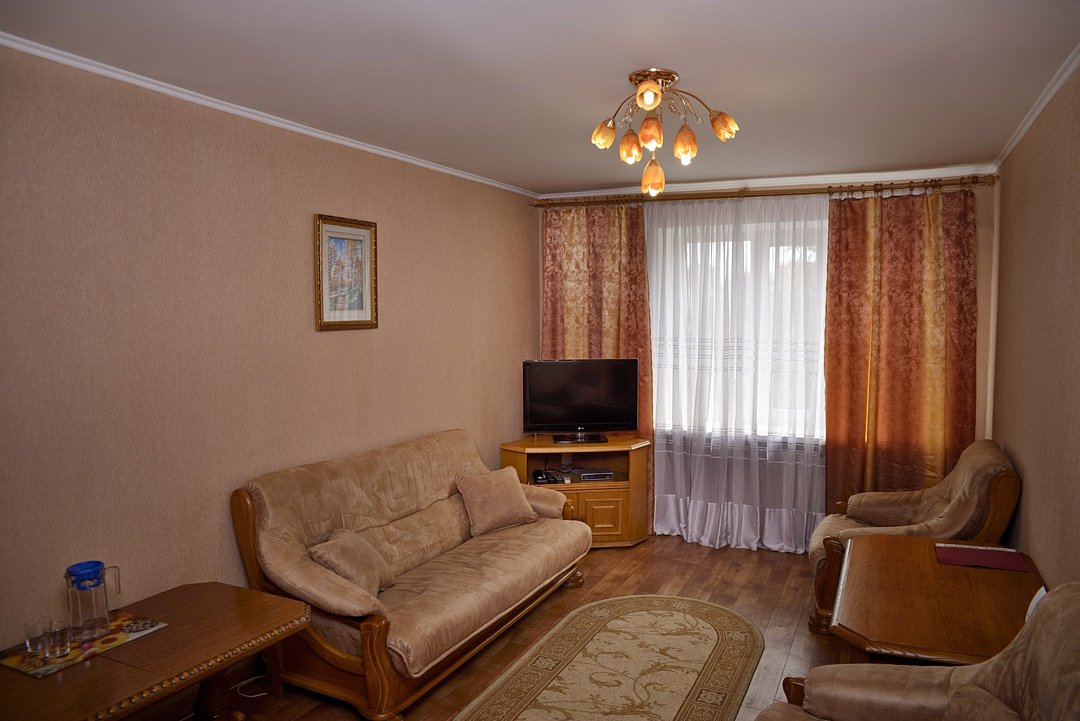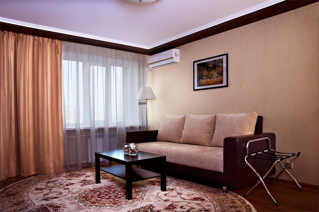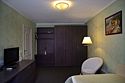 Wi-Fi, две телефонные линии, холодильник, настольные лампы, фен, банные полотенца, гигиенические средства, косметические средства, две односпальные или большая двуспальная кровать, диван, кресла, тумбы, стулья, шкаф для одежды, гардеробная, вешалки, журнальный столик, зеркало, ковер, две комнаты, набор посуды, обслуживание номеров, информационная карта, меню, чайник, унитаз, раковина, косметическое зеркало, отопление, душ, вид на город, кулер на этаже, стаканы, столовые приборы, туалетные средства, сплит-система, цифровое тв, телевизор с плоским экраном, гостиничная парфюмерия, номер для некурящих, антибактериальное средство для рукВ номере