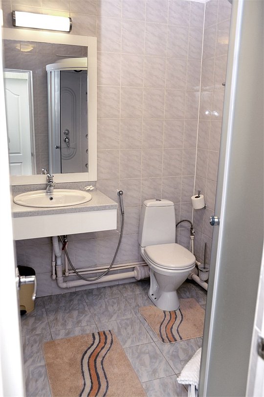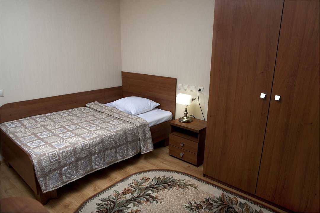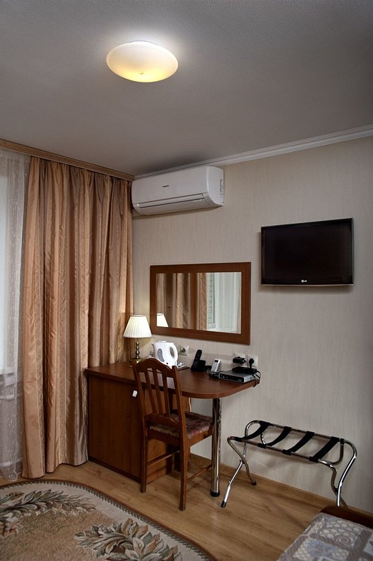 Wi-Fi, две телефонные линии, холодильник, настольные лампы, фен, душевая кабина, банные полотенца, гигиенические средства, косметические средства, полутораспальная кровать, стулья, вешалки, письменный стол, зеркало, ковер, набор посуды, обслуживание номеров, информационная карта, меню, чайник, унитаз, раковина, косметическое зеркало, отопление, вид на город, кулер на этаже, кресло, стаканы, столовые приборы, туалетные средства, сплит-система, цифровое тв, телевизор с плоским экраном, шкаф-купе, гостиничная парфюмерия, номер для некурящих, пуфик, рабочий стол, антибактериальное средство для рукВ номере