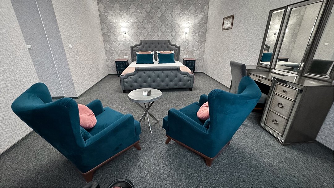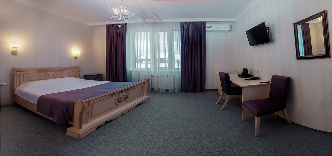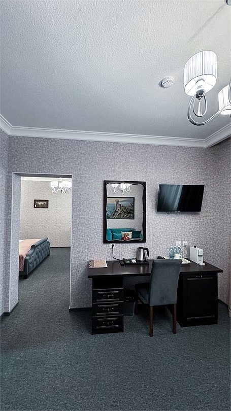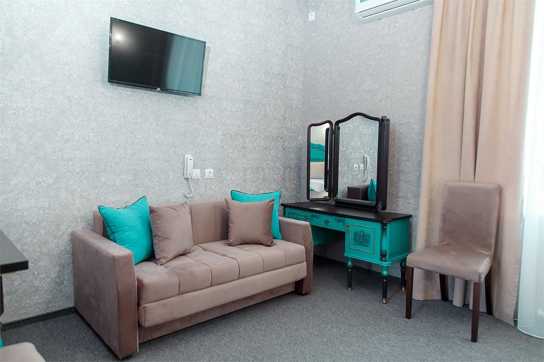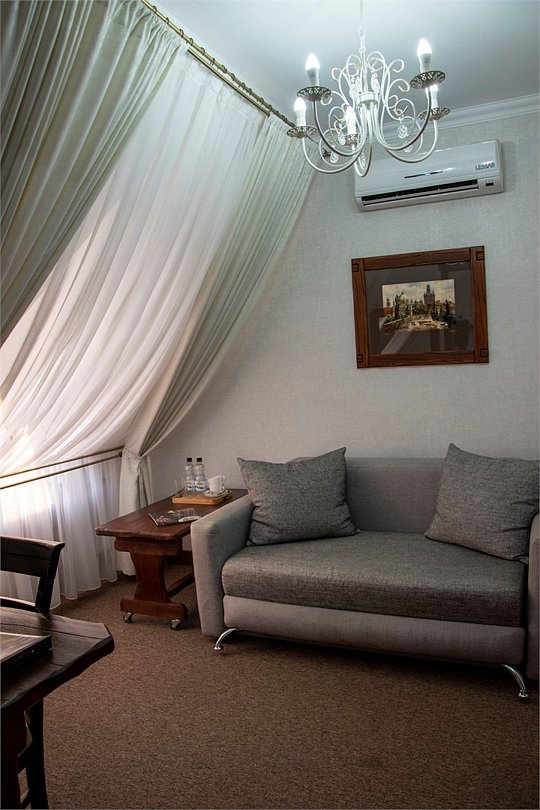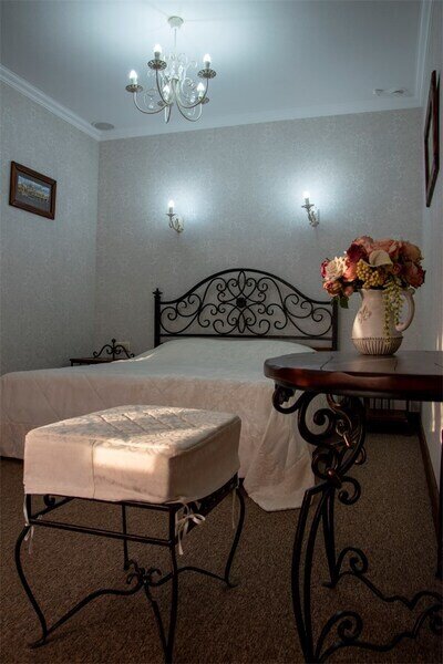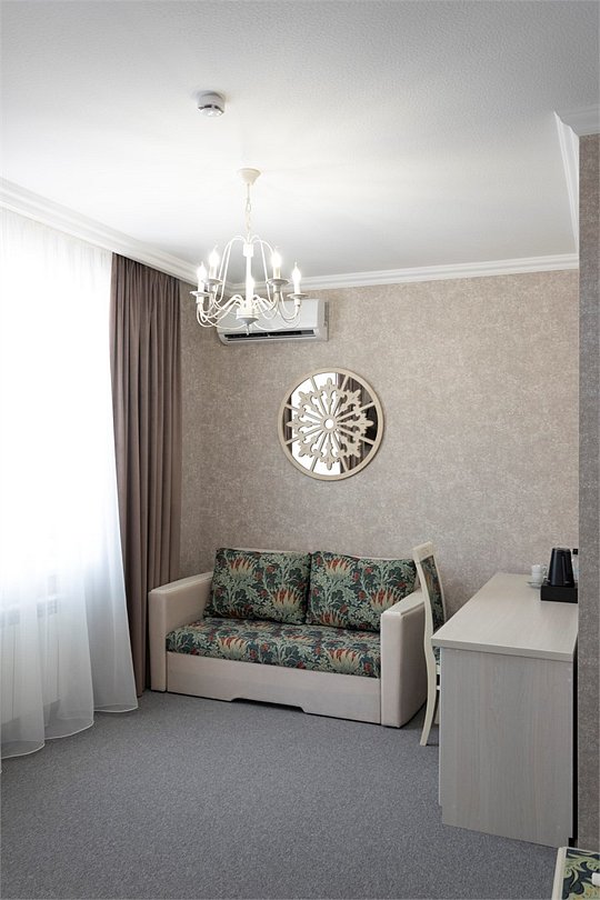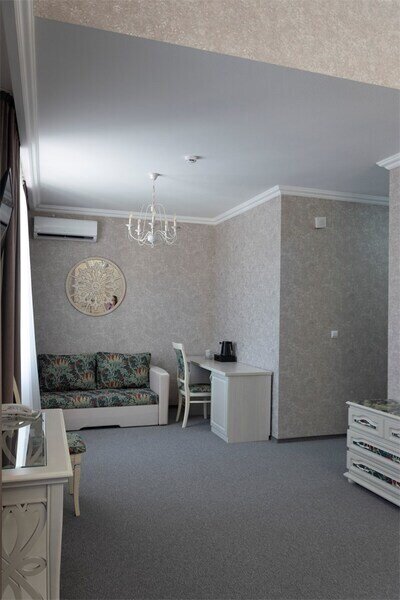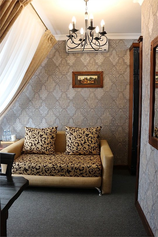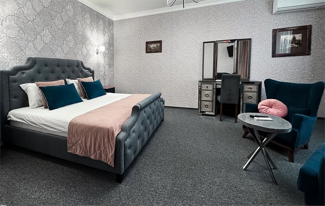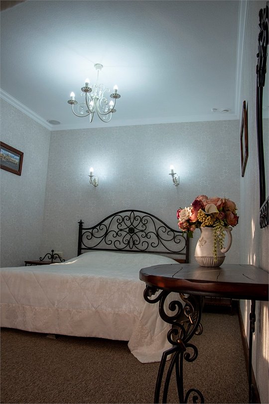 Двухкомнатный просторный представительский люкс ,площадью 44 кв.м. с кроватью размера king-size 180*200 см и диваном 170*210 см. Номер располагается на 3 этаже нового корпуса бутик отеля. Собственная ванная комната с ванной укомплектована туалетно-косметическими принадлежностями, халатами и тапочками. В номере мини-холодильник, телевизор с плоским экраном, кондиционер, сейф. В стоимость номера включен континентальный завтрак по меню, охраняемая парковка под видеонаблюдением.Услуги и удобства