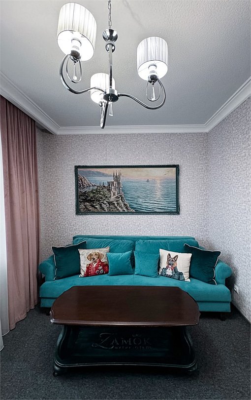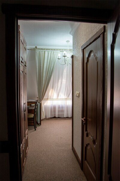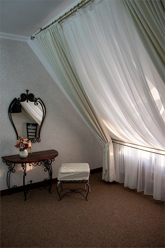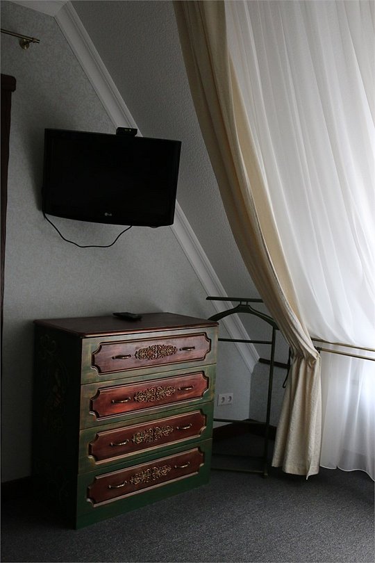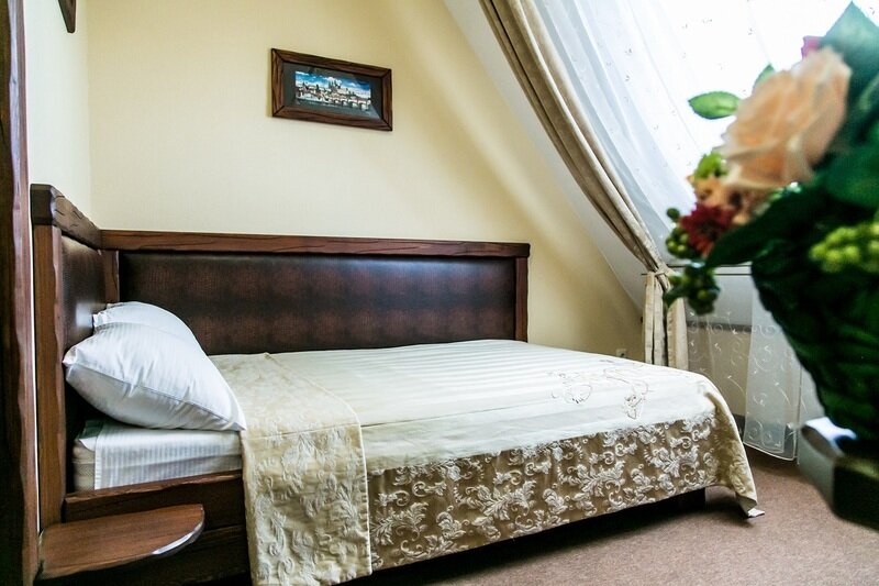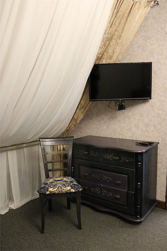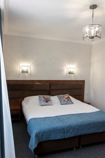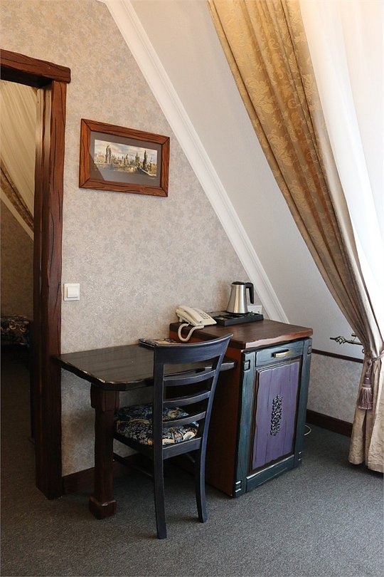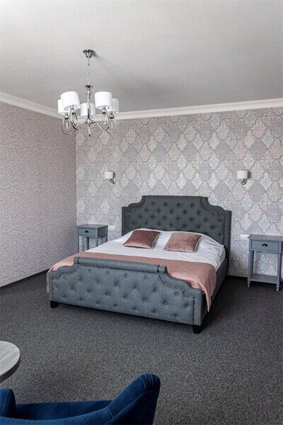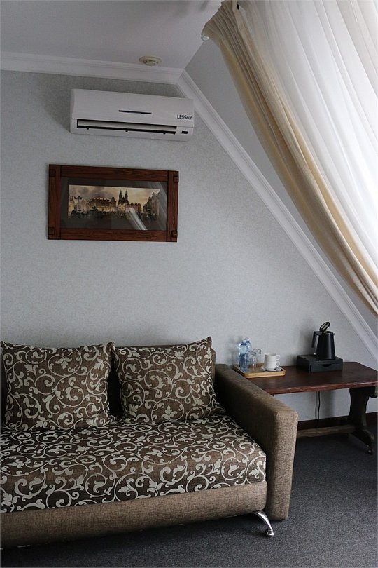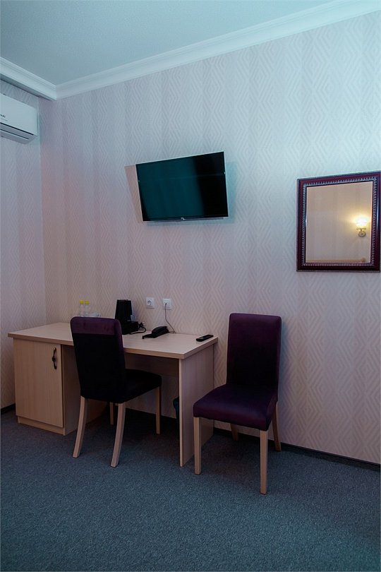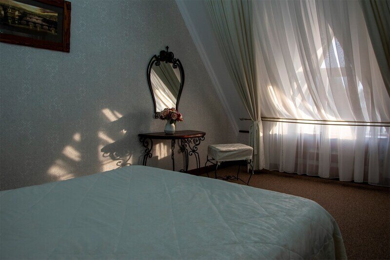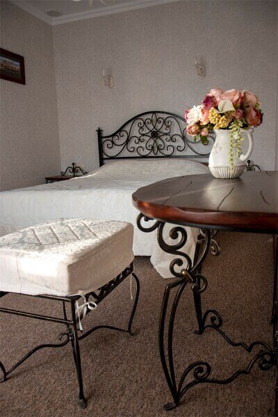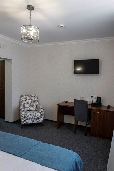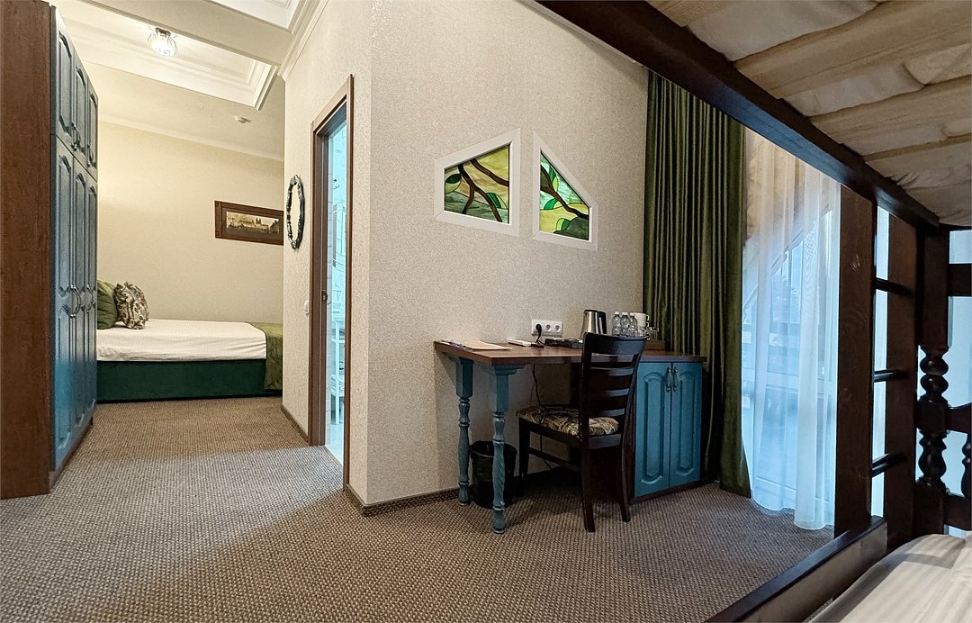 Двухкомнатный просторный представительский люкс ,площадью 44 кв.м. с кроватью размера king-size 180*200 см и диваном 170*210 см. Номер располагается на 3 этаже нового корпуса бутик отеля. Собственная ванная комната с ванной укомплектована туалетно-косметическими принадлежностями, халатами и тапочками. В номере мини-холодильник, телевизор с плоским экраном, кондиционер, сейф. В стоимость номера включен континентальный завтрак по меню, охраняемая парковка под видеонаблюдением.Услуги и удобства