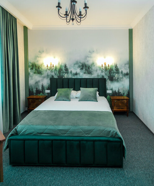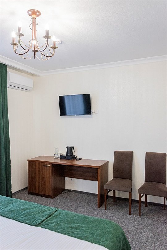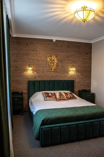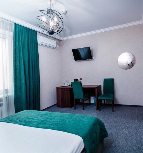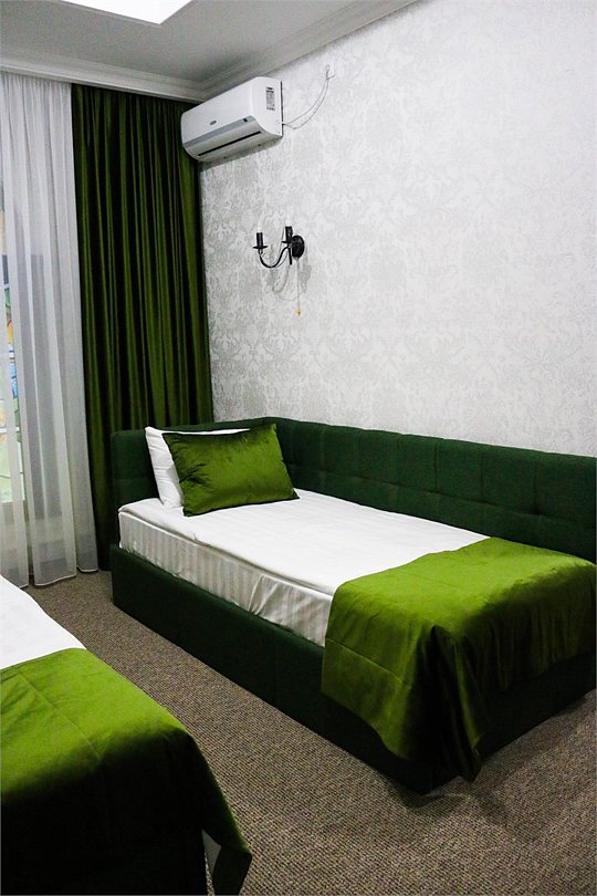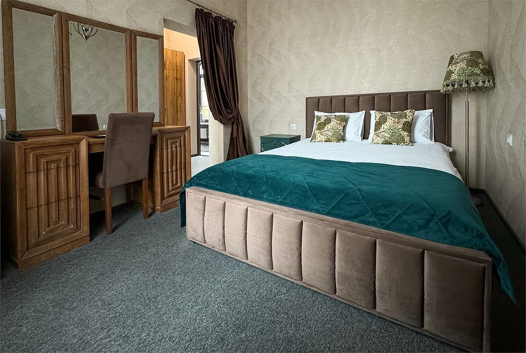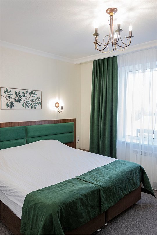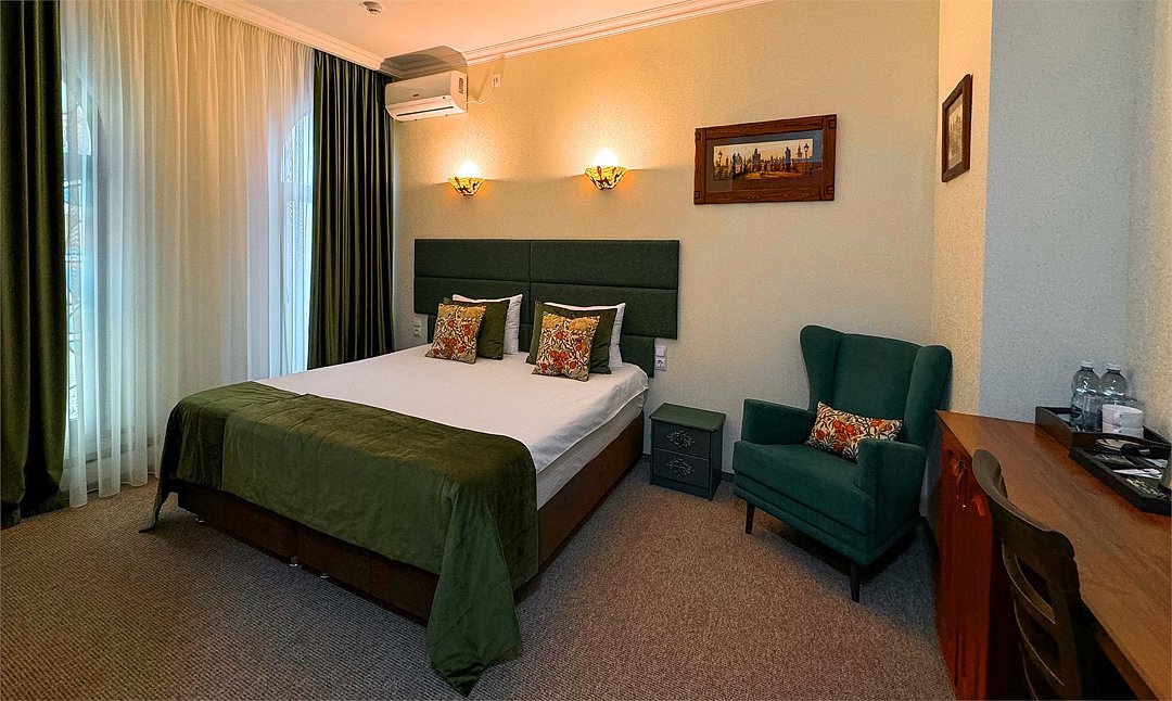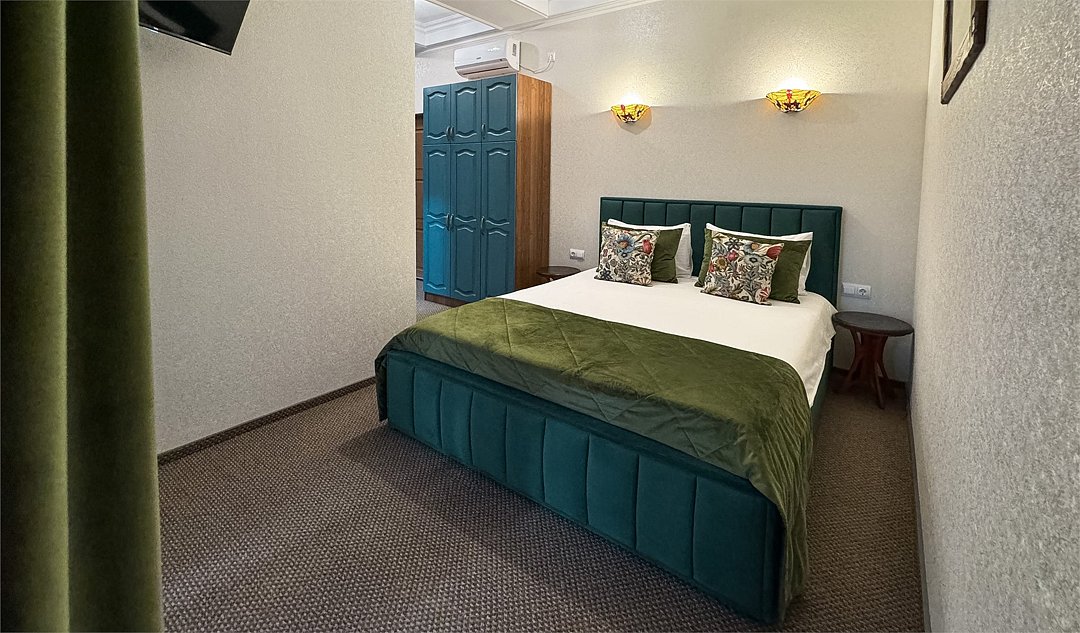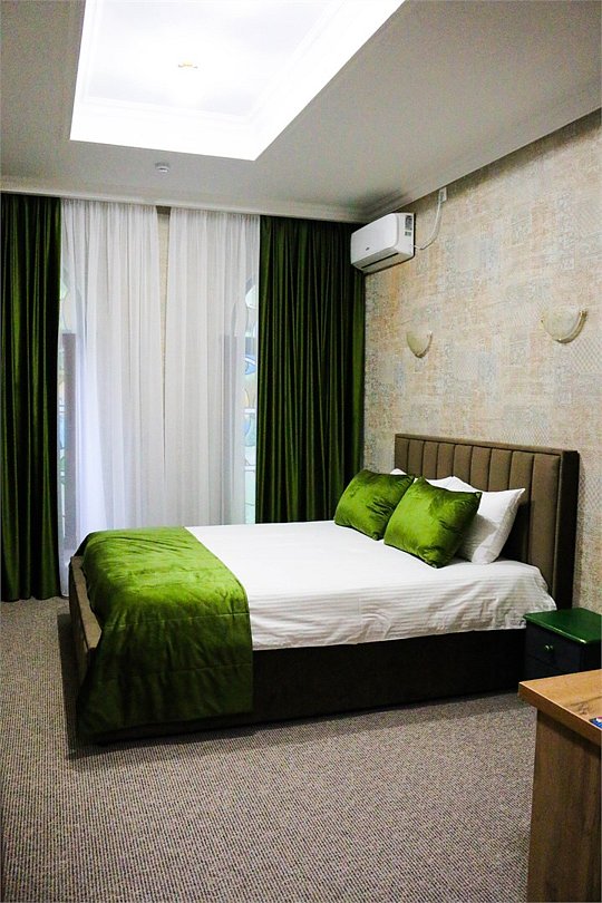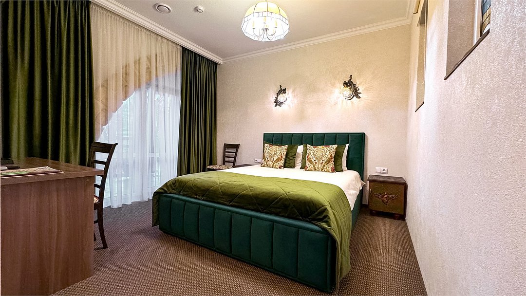 Эксклюзивный номер категории полулюкс с большой кроватью с мягким изголовьем 160*200, номер выполнен в зеленых оттенках природного цвета. Площадь номера 26 кв.м. Номер располагается на 2 этаже нового корпуса бутик отеля. Собственная ванная комната укомплектована туалетно-косметическими принадлежностями, тапочки, халаты. . Чайная станция с чаем и кофе, бутилированная вода. В номере мини-холодильник, телевизор с плоским экраном, кондиционер. В стоимость номера включен континентальный завтрак по меню, охраняемая парковка под видеонаблюдением.Услуги и удобства