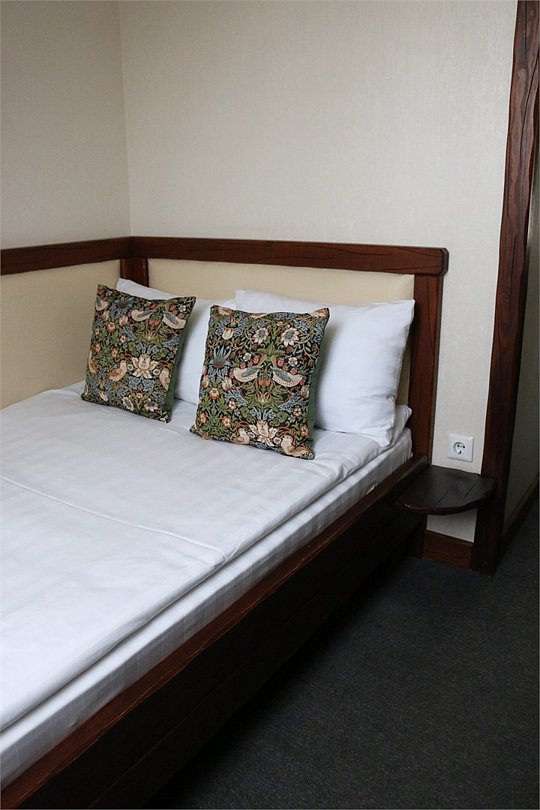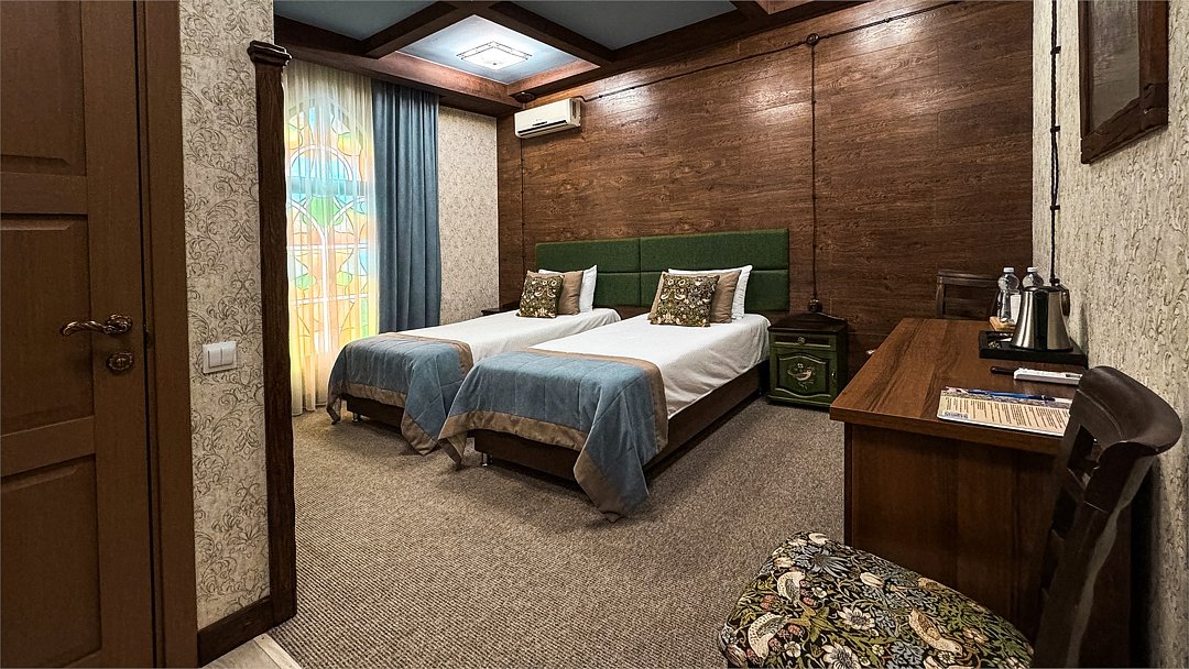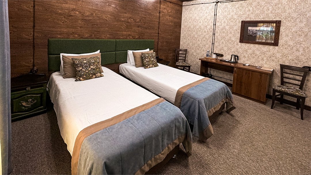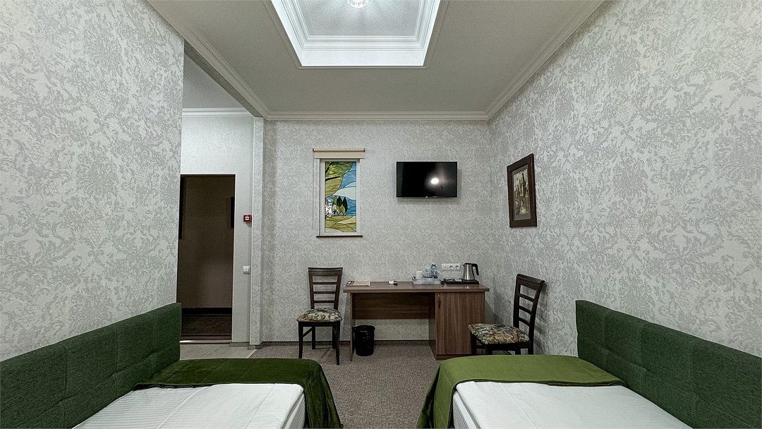 Номер категории стандарт , с двумя односпальными 90*200см или одной большой двухспальной кроватью 180*200 см, располагается на 3 этаже нового корпуса бутик отеля. Площадь номера 26 кв.м. Чайная станция с чаем и кофе, бутилированная вода. Просторная ванная комната укомплектована туалетно-косметическими принадлежностями ,халатами и тапочками . В стоимость номера включен континентальный завтрак по меню, охраняемая парковка под видеонаблюдениемУслуги и удобства