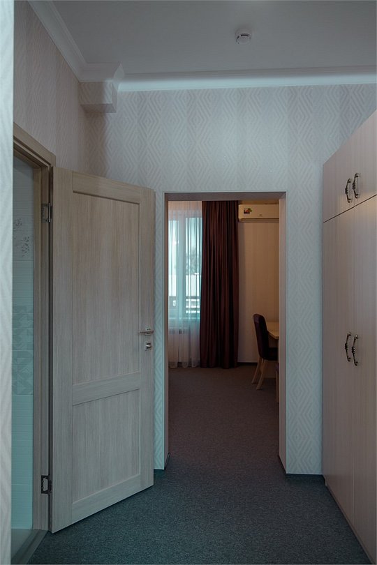 Номер категории полулюкс выполненный в светлых тонах. Площадь номера 26кв.м. Номер располагается на 2 этаже нового корпуса бутик отеля. В номере большая кровать 160*200см .В номере мини-холодильник ,телевизор ,сплит система, чайная станция с чаем и кофе, бутилированная вода. Просторная ванная комната укомплектована туалетно-косметическими принадлежностями ,халатами и тапочками . В стоимость номера включен континентальный завтрак по меню, охраняемая парковка под видеонаблюдениемУслуги и удобства