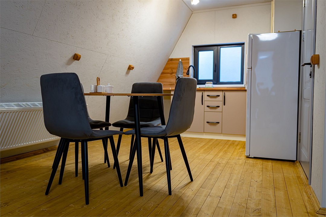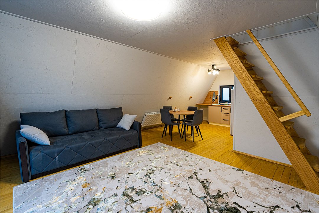 Номер предлагает уютное пространство с современным дизайном в минималистичном стиле. Светлые тона интерьера и большие окна создают атмосферу открытости и комфорта. Гостевая зона с диваном плавно переходит в обеденную зону и компактную кухню. На втором уровне, куда ведет деревянная лестница, расположены спальные места с панорамными окнами для приятного отдыха.Услуги и удобства