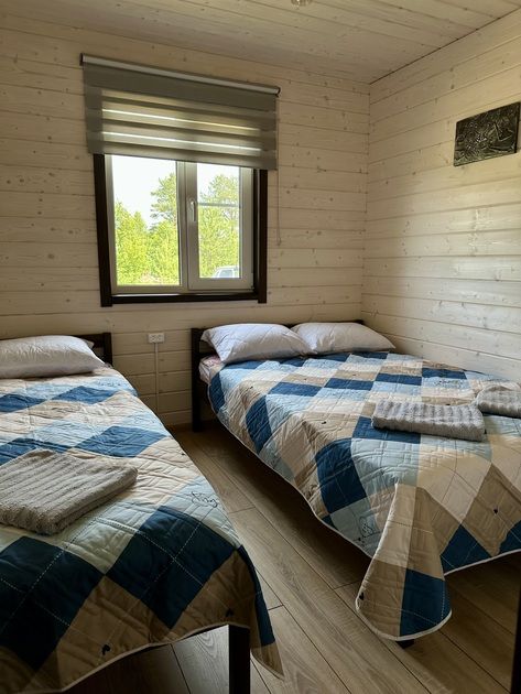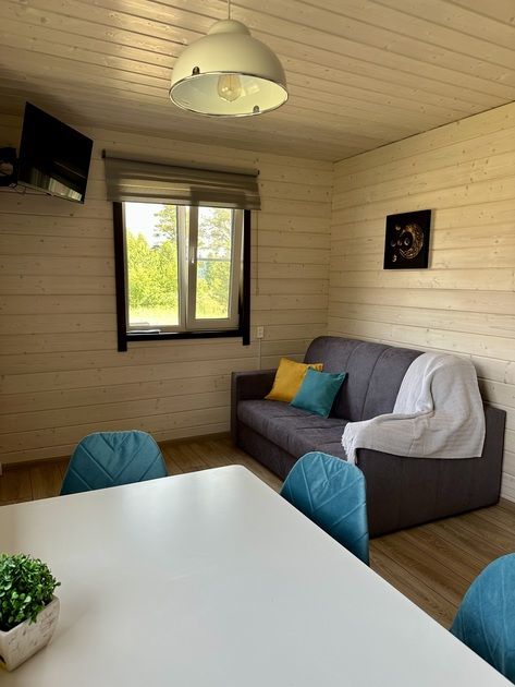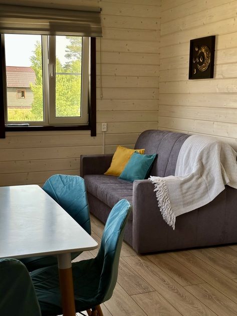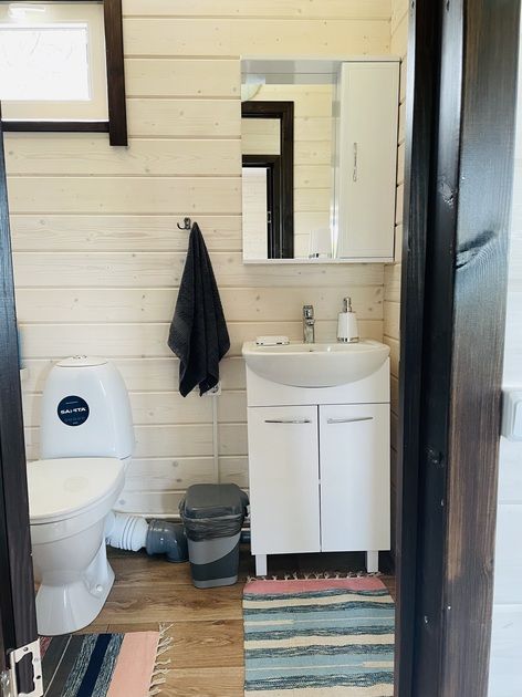 В доме одна спальная комната (2 кровати: шириной 130 и 80 см, шкаф, тумбочка), кухня (диван, ТВ, холодильник, микроволновка) и санузел (туалет, раковина, душ).