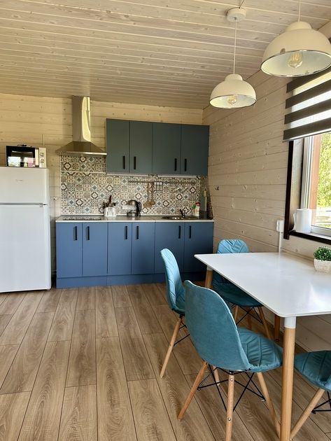 На первом этаже: спальня (две кровати — шириной 130 и 80 см, стеллаж для одежды), кухня (ТВ, холодильник, микроволновка, пол с подогревом), санузел (туалет, раковина, душ)