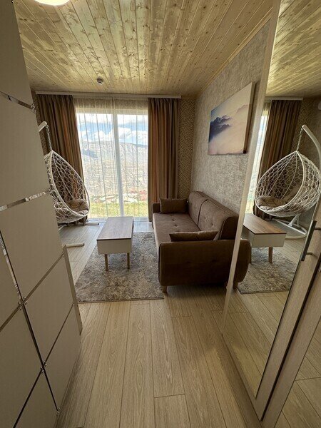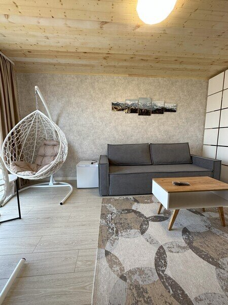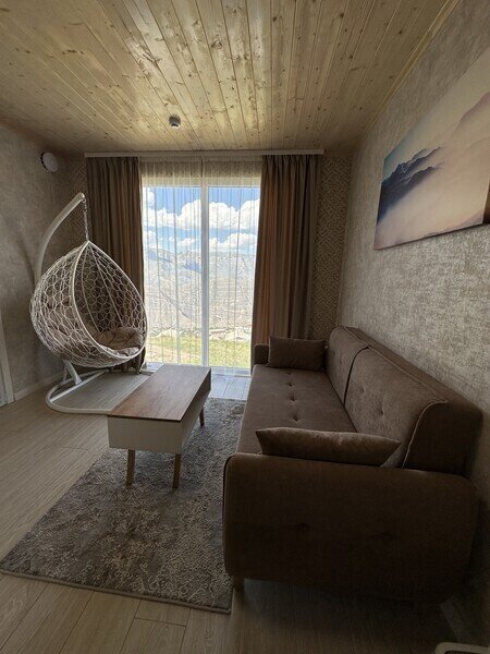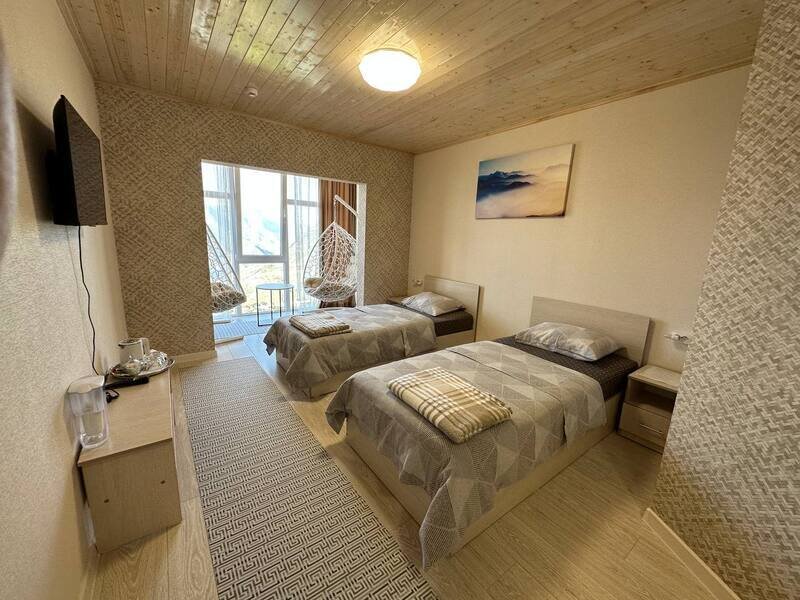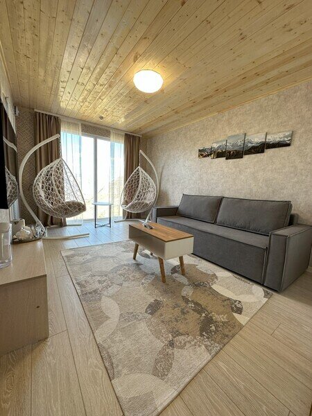 Двухместный номер с террасой. Этот номер предлагает комфортабельные условия проживания с удобной кроватью и гостиной зоной и основными удобствами, а также имеет террасу, где вы можете насладиться видами на горы и окружающую природу. Такой номер является отличным выбором для пары или двух человек, желающих насладиться покоем и природой в горах.