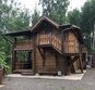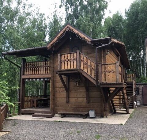 Двухэтажный дом выполнен из кедра, имеет балкон с видом на озеро.