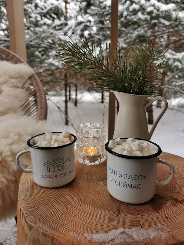 Угольный самовар растапливается сухими сосновыми шишками. Подается с фарфоровым сервизом, бубликами и вареньем из молодых сосновых шишек.