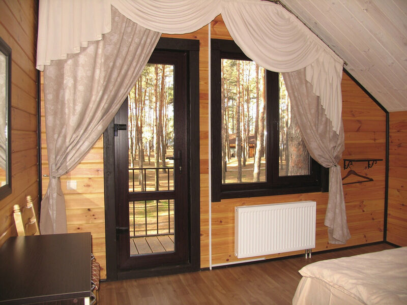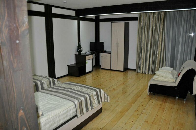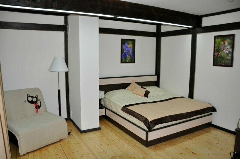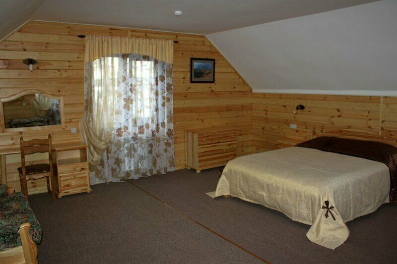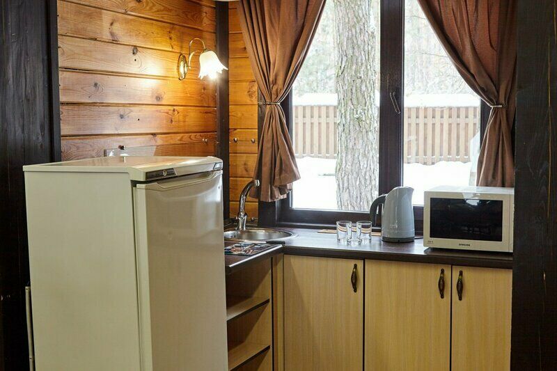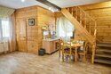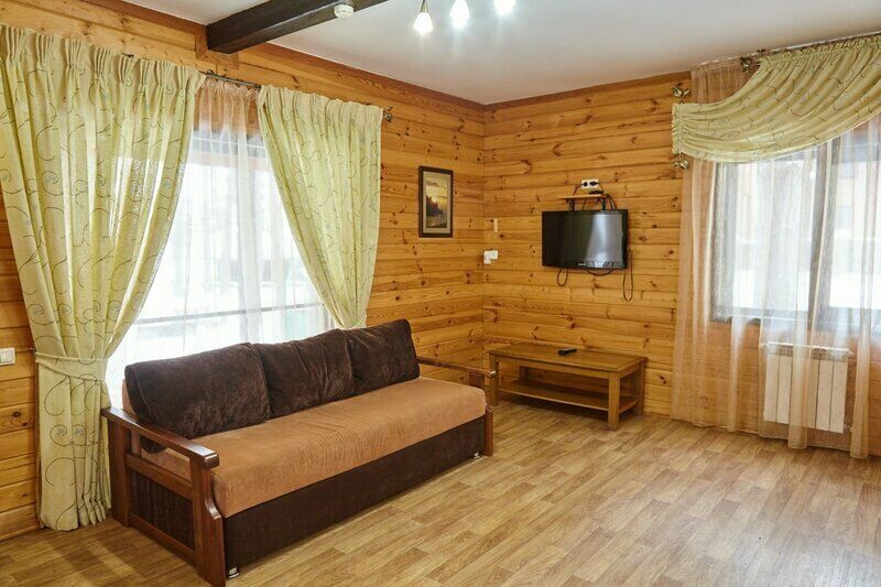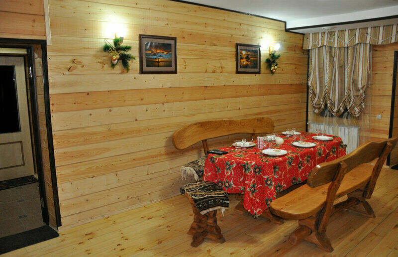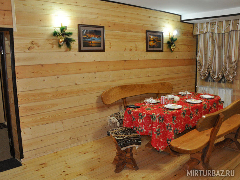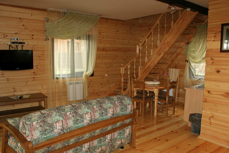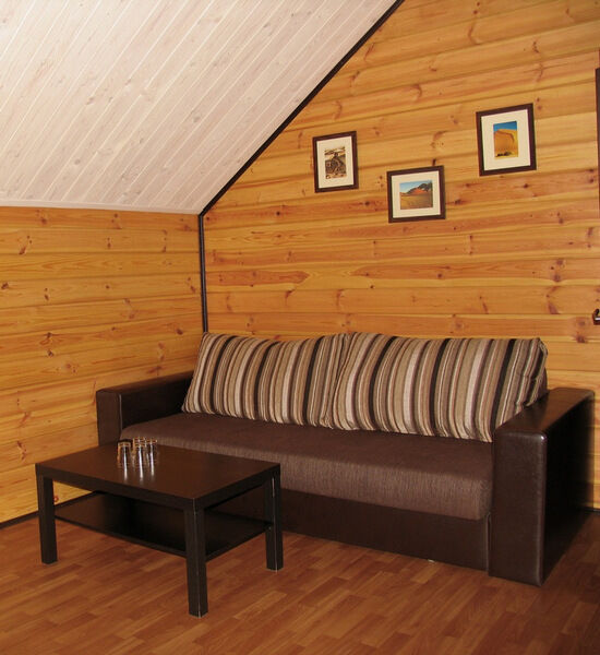 Оборудована микроволновкой , чайником и холодильником. Неповторимый уют помещению создают диваны и электрокамин. Присутствие телевизора и музыкальнного центра поможет весело провести время. На улице находится мангал и подсобный стол.